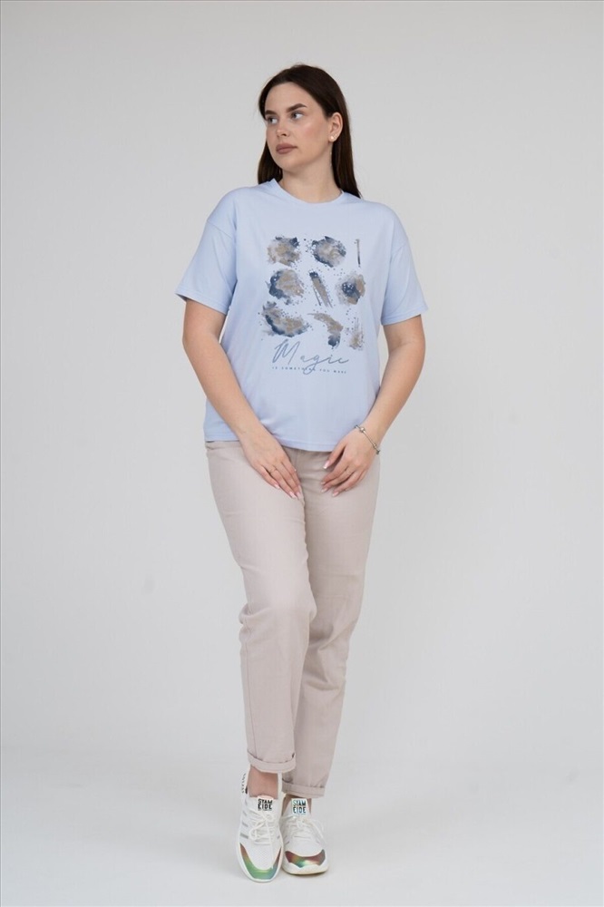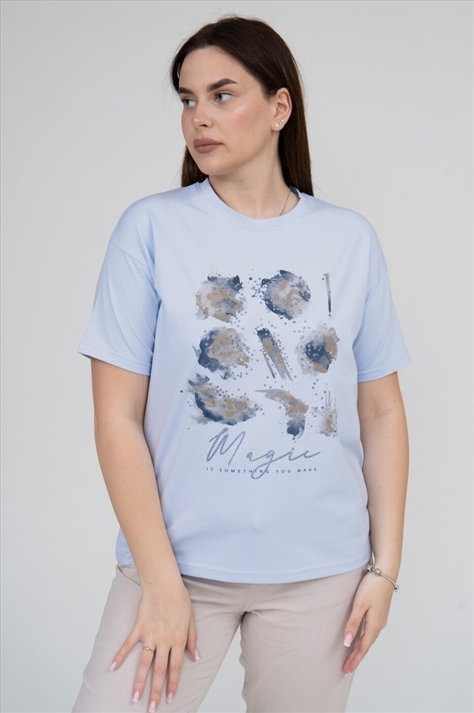 Страна производства: Россия Футболка для женщин прямого силуэта, длиной до середины бедер. Рукав втачной, короткий. Горловина округлой формы. Полочка футболки украшена принтом.