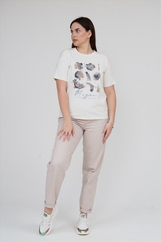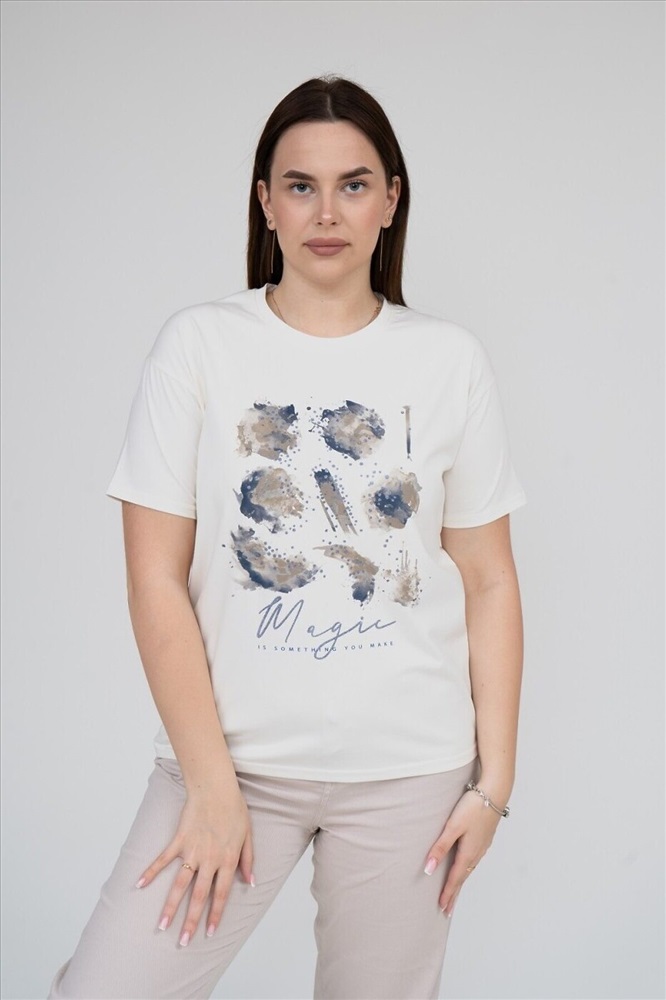 Страна производства: Россия Футболка для женщин прямого силуэта, длиной до середины бедер. Рукав втачной, короткий. Горловина округлой формы. Полочка футболки украшена принтом.