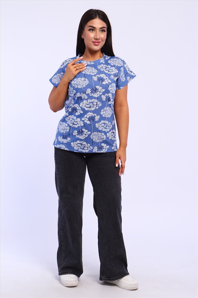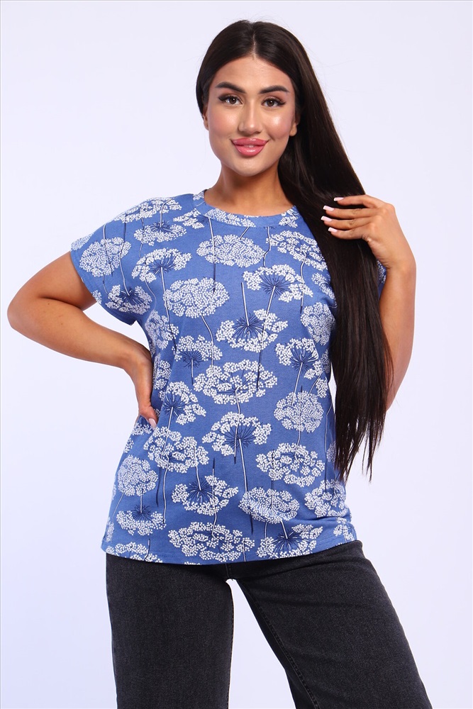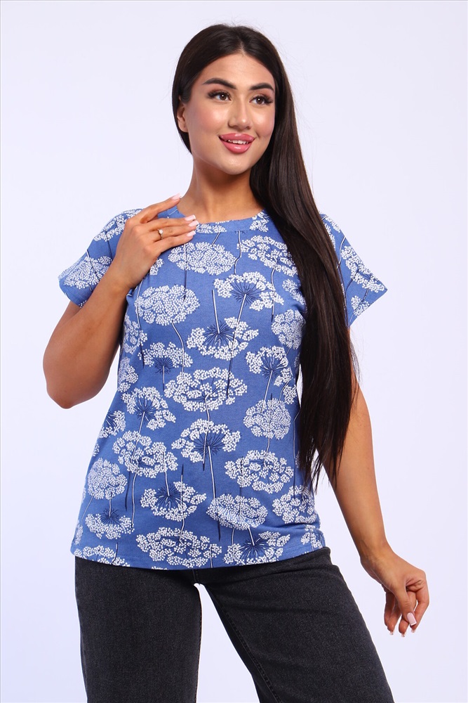 ID товара: 1018398 Состав: 100% Хлопок Сезон: Весна/Лето Фасон: Прямой Рукав: Короткий Вырез горловины: Круглый Рисунок: растительный, цветочный Вид ткани: Кулирка Страна бренда: Россия Страна производства: Россия Футболка женская свободного кроя из кулирного полотна, 100% хлопок. Футболка прямого кроя, горловина обработана обтачкой, низ и рукава обработаны на плоскшовной машине. Идеальный вариант для повседневной носки и жаркого лета. Комментарии к товару