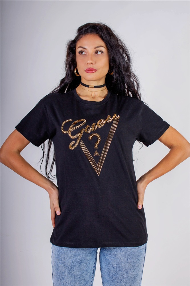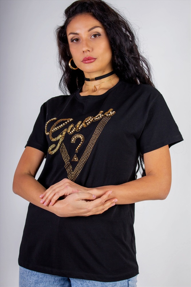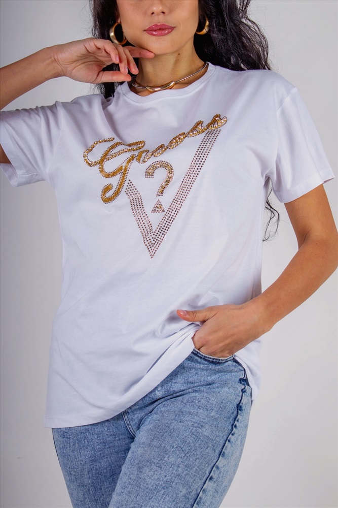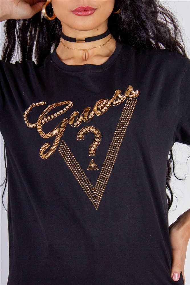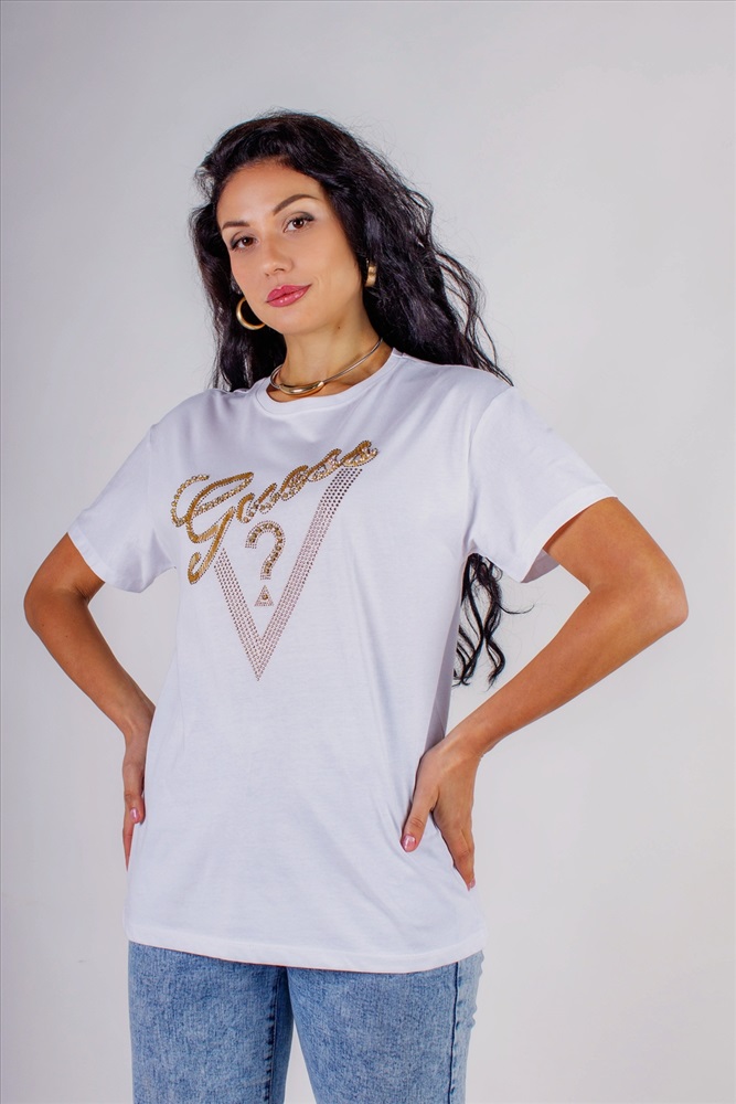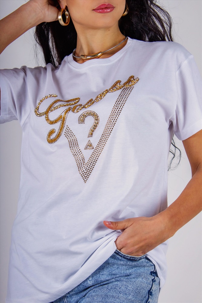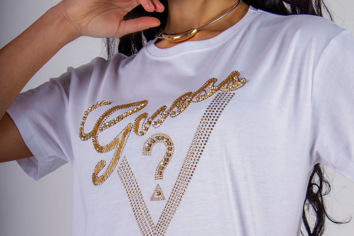 Модель: Футболка "Guess" с треугольником стразы, камешки, бусины