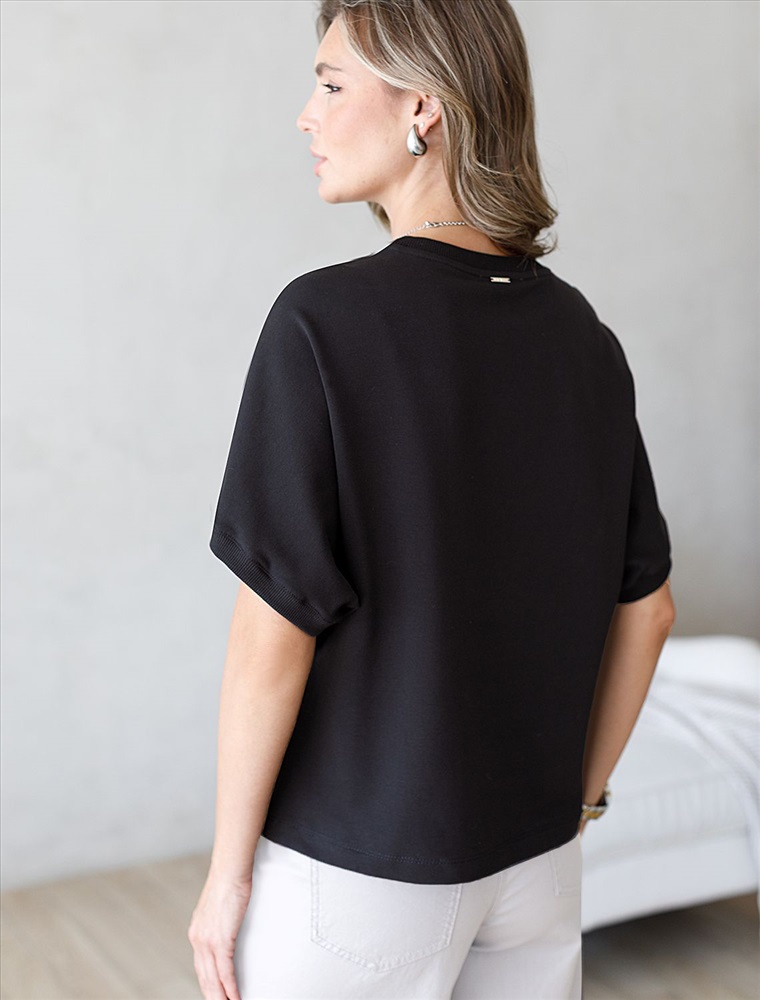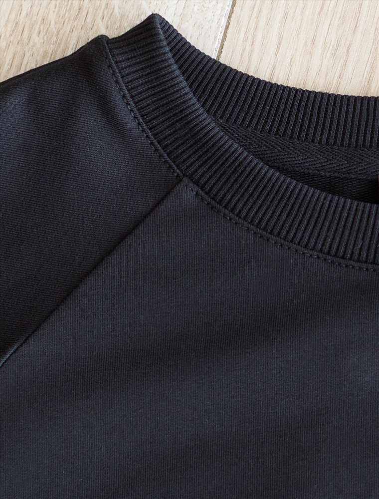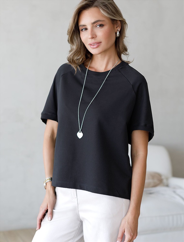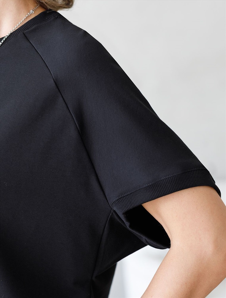 Футболка черного цвета свободного кроя выполнена из премиального футера двухнитки с эластаном плотностью 240 Г/м2. . Натуральный материал отличается мягкостью и приятной текстурой, позволяя коже дышать и обеспечивая максимальное удобство при носке. Наличие эластана в составе изделия гарантирует абсолютный комфорт и формоустойчивость. Круглый ворот, рукава регланы средней длины и спущенная линия плеча придают футболке стильный и современный вид, делают образ расслабленным и непринужденным, такой вариант отлично сядет на большие размеры. Плотная футболка идеально подходит для повседневной носки и незаменима для тех, кто ценит удобство и свободу движений без компромиссов по стилю.