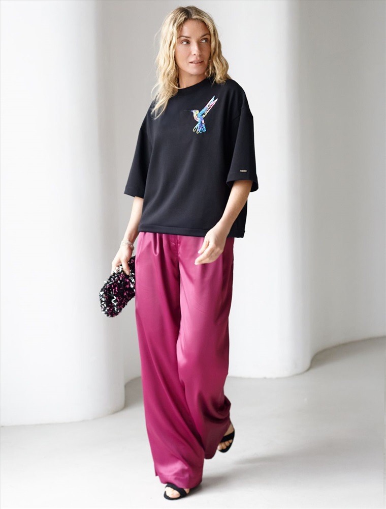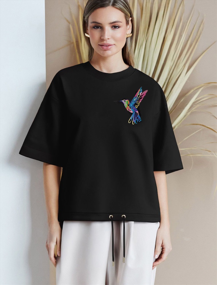 Футболка выполнена из эластичного футера двухнитки, дополнена акцентной вышивкой на груди. Модель свободного кроя, по низу изделия дополнена хлопковым шнуром с металлической фурнитурой. Изделие сочетается в костюме с шортами D48.010, брюками D44.135 и D44.137