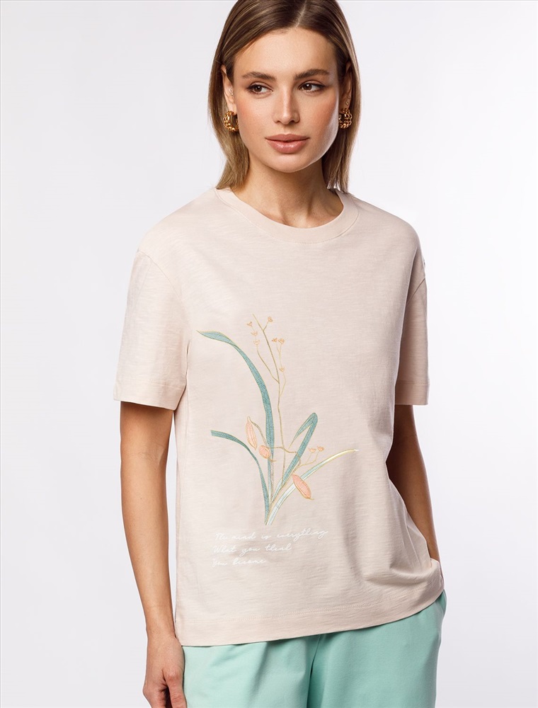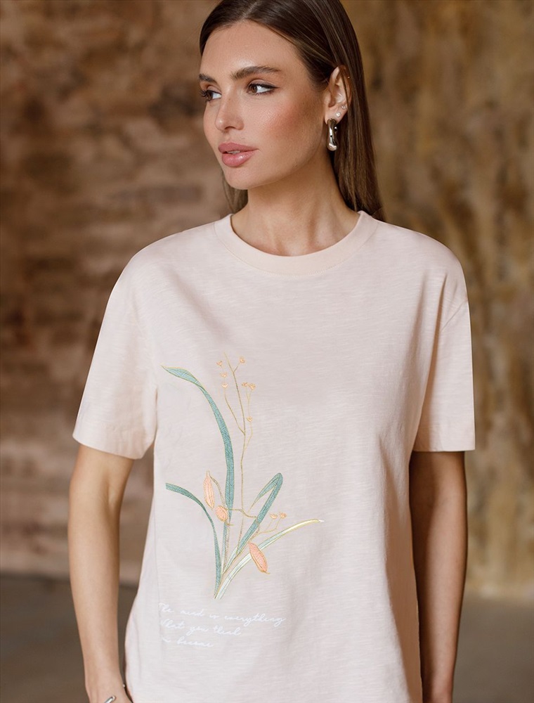 Перевод принта: The mind is everything, what you think you become - мысли материальны, ты то, о чем ты думаешь. Футболка выполнена из фактурного полотна из 100% хлопка. Модель с лаконичным авторским принтом легко впишется в любой весенне-летний гардероб. Ткань имеет характерный рисунок черточки за счет сочетания разных волокон хлопка 140-150 г. Хорошо держит форму и поддерживает комфортный микроклимат в течении дня.