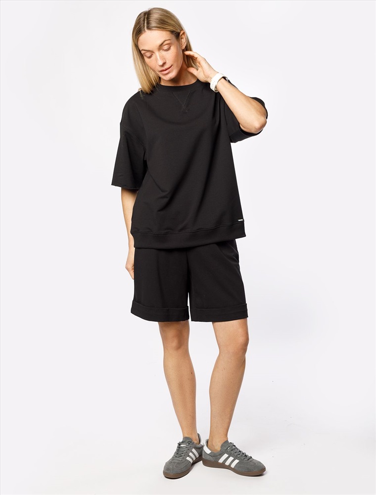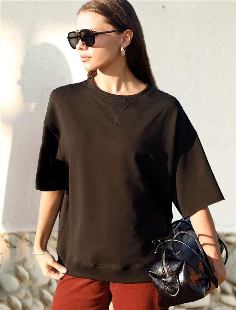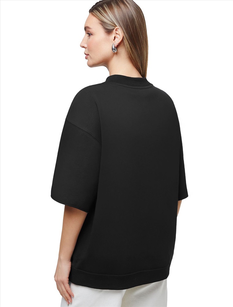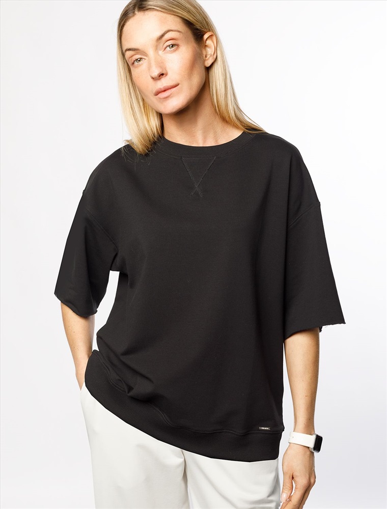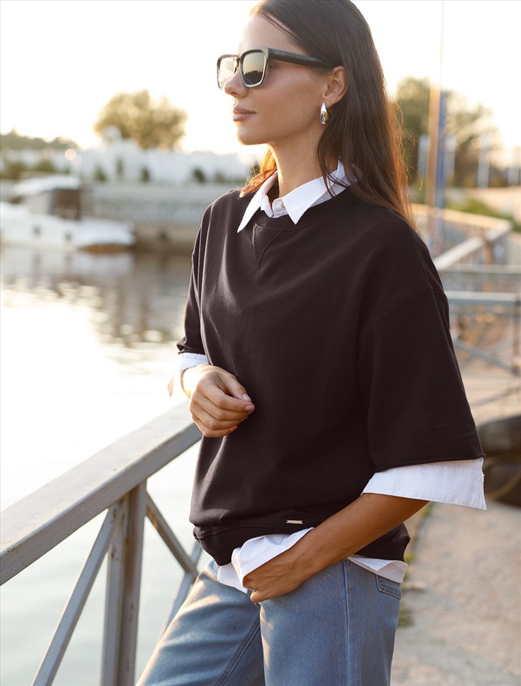 Плотность: 240 Г/м2 Параметры модели на первом фото: Рост 172, бюст 88, талия 64, бедра 88 Футболка свободного кроя со спущенным плечом выполнена из футера двухнитки с эластаном. Лаконичный принт нанесен фактурной краской. Эластичный материал гарантирует комфорт и формоустойчивость. Сочетается в костюме с брюками D44.138, D44.139 и шортами D48.008. Изделие дополнено металлическим логотипом бренда. Комментарии к товару
