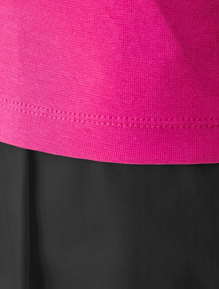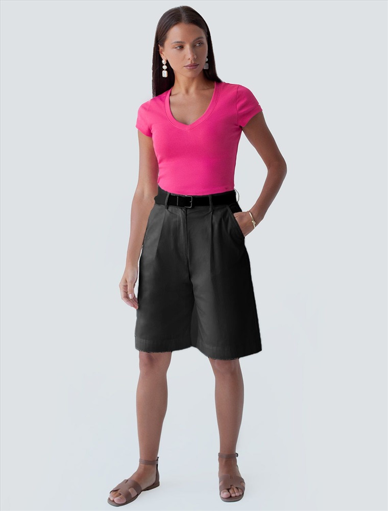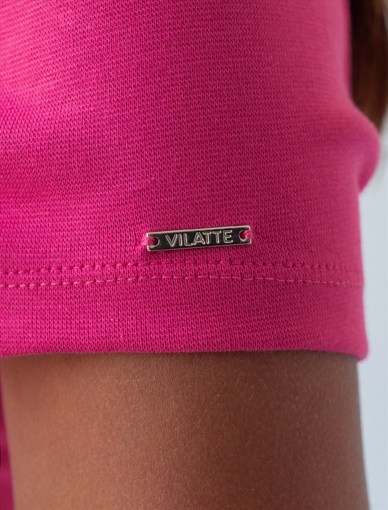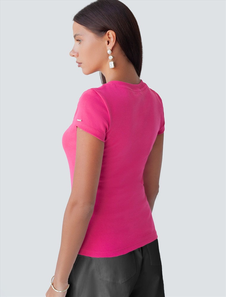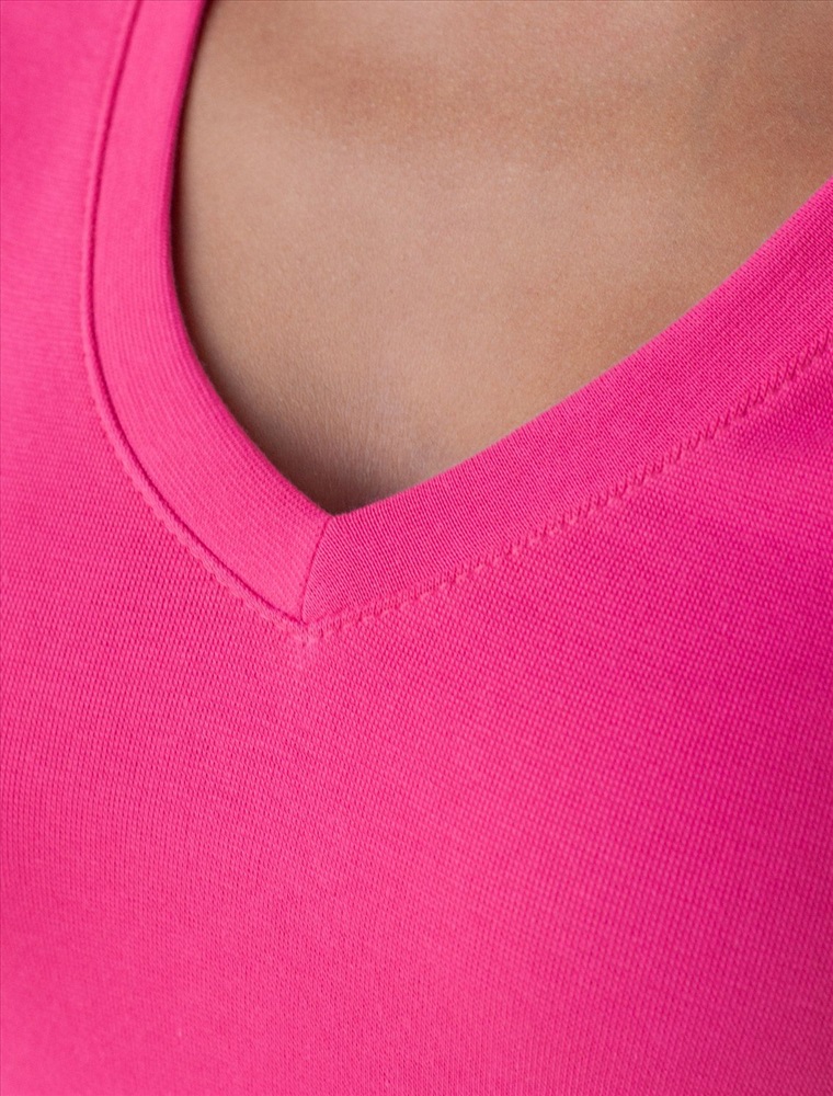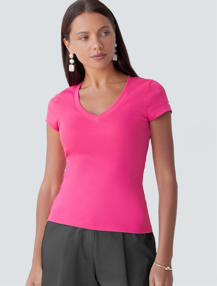 Облегающая футболка с V-образным вырезом цвета фуксия создаст утонченный образ. Идеальная базовая модель для вашего гардероба! Глубокий V-образный вырез подчеркивает линию шеи и зрительно удлиняет силуэт. Футболка выполнена из хлопка с добавлением эластана, которая мягко облегает контуры тела, подчеркивая достоинства фигуры. Универсальный вариант для создания стильных повседневных образов.