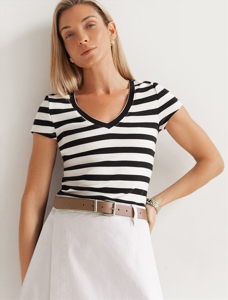 Облегающая футболка с V-образным вырезом в черно-белую полоску создаст утонченный образ. Идеальная базовая модель для вашего гардероба! Глубокий V-образный вырез подчеркивает линию шеи и зрительно удлиняет силуэт. Футболка выполнена из хлопка с добавлением эластана, которая мягко облегает контуры тела, подчеркивая достоинства фигуры. Универсальный вариант для создания стильных повседневных образов.