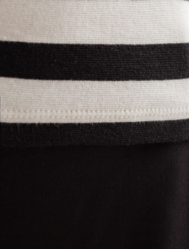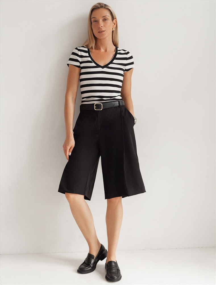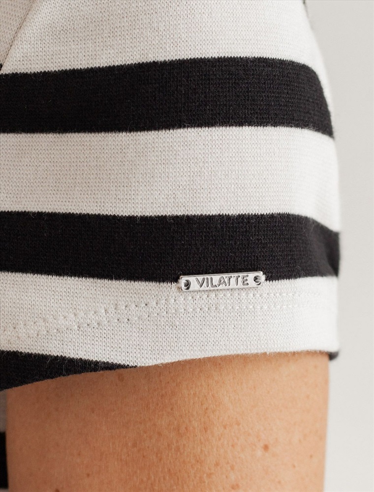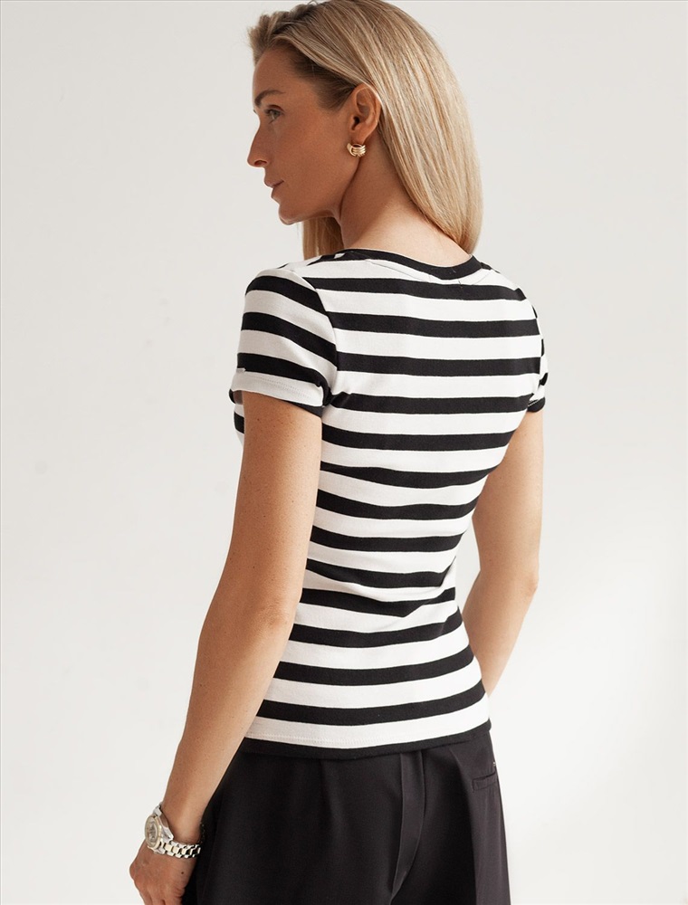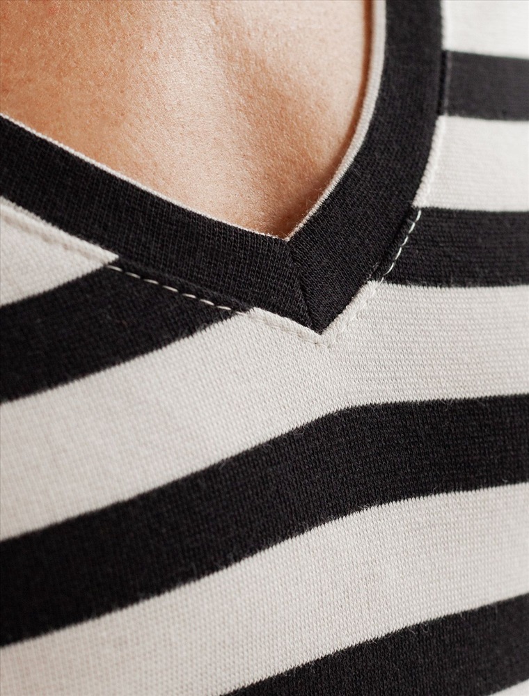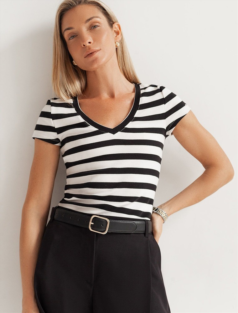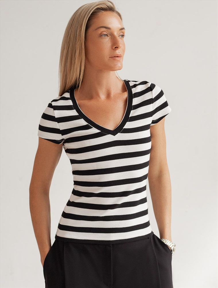Плотность: 210 Г/м2 Облегающая футболка с V-образным вырезом в черно-белую полоску создаст утонченный образ. Идеальная базовая модель для вашего гардероба! Глубокий V-образный вырез подчеркивает линию шеи и зрительно удлиняет силуэт. Футболка выполнена из хлопка с добавлением эластана, которая мягко облегает контуры тела, подчеркивая достоинства фигуры. Универсальный вариант для создания стильных повседневных образов. Комментарии к товару