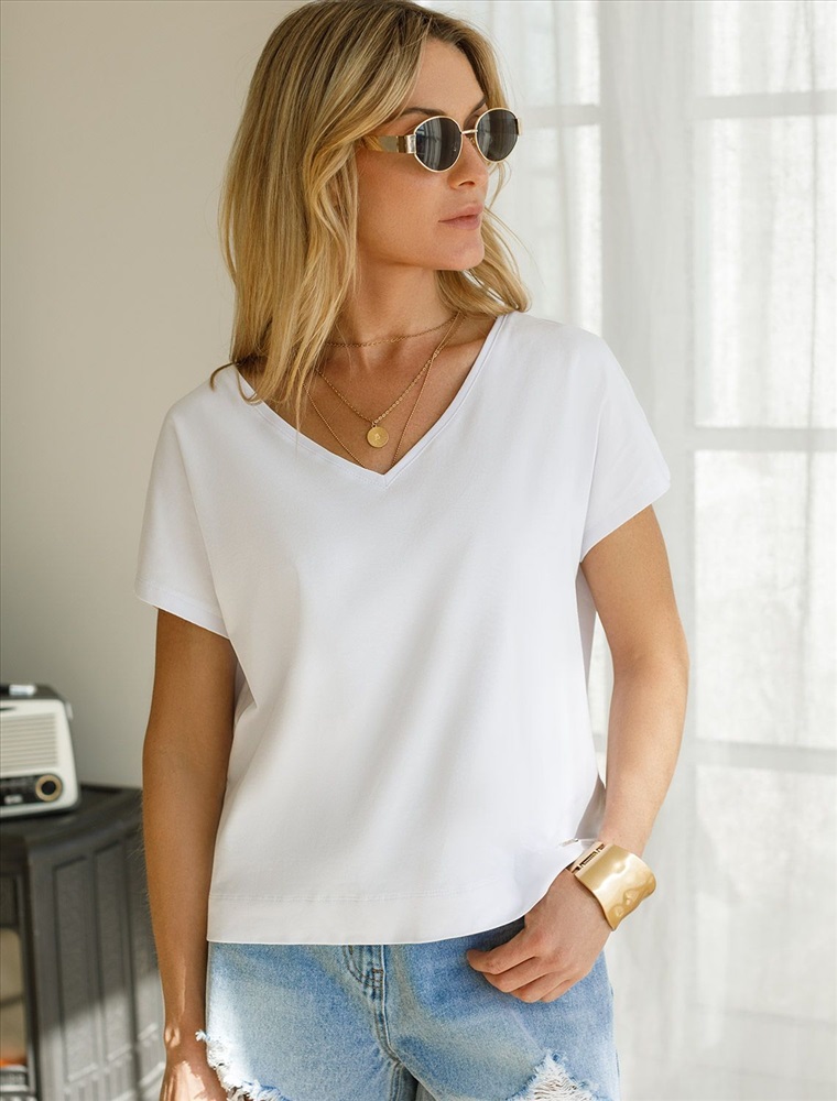 Плотность: 170 Г/м2 Параметры модели на первом фото: Рост 172, бюст 88, талия 64, бедра 88 Размер товара на первом фото: 42 Свободная футболка с V-вырезом белого цвета выполнена из качественной кулирной глади плотностью 150 г/м² - это оптимальная толщина, ткань достаточно плотная, чтобы не просвечивать, но при этом легкая и мягкая. Натуральный хлопок позволяет телу дышать, а небольшое содержание эластана гарантирует, что футболка сохранит свой первоначальный вид даже после множества стирок. Эта футболка идеальна для абсолютной свободы и расслабленного стиля. Её оверсайз-силуэт в сочетании с мягкими линиями создает современный, летящий образ, который вписывается в концепцию комфортного городского гардероба. V-образный вырез визуально удлиняет шею и акцентирует зону декольте, добавляя образу женственности и легкости. Благодаря такому вырезу свободный крой футболки выглядит более изящным. Отсутствие плечевого шва создает мягкую, покатую линию плеча. Такой крой не ограничивает движения и идеально садится на любую фигуру, в том числе большие размеры, скрывает нюансы и подчеркивает хрупкость силуэта. Футболка мягко драпируется, обеспечивая отличную вентиляцию в жаркую погоду и даря ощущение полного комфорта. Повседневная футболка сочетается с базовыми и акцентными элементами одежды, позволяет создавать различные лаконичные или яркие образы. Комментарии к товару
