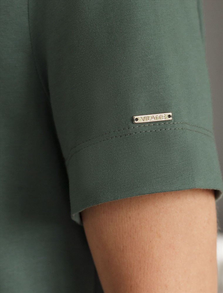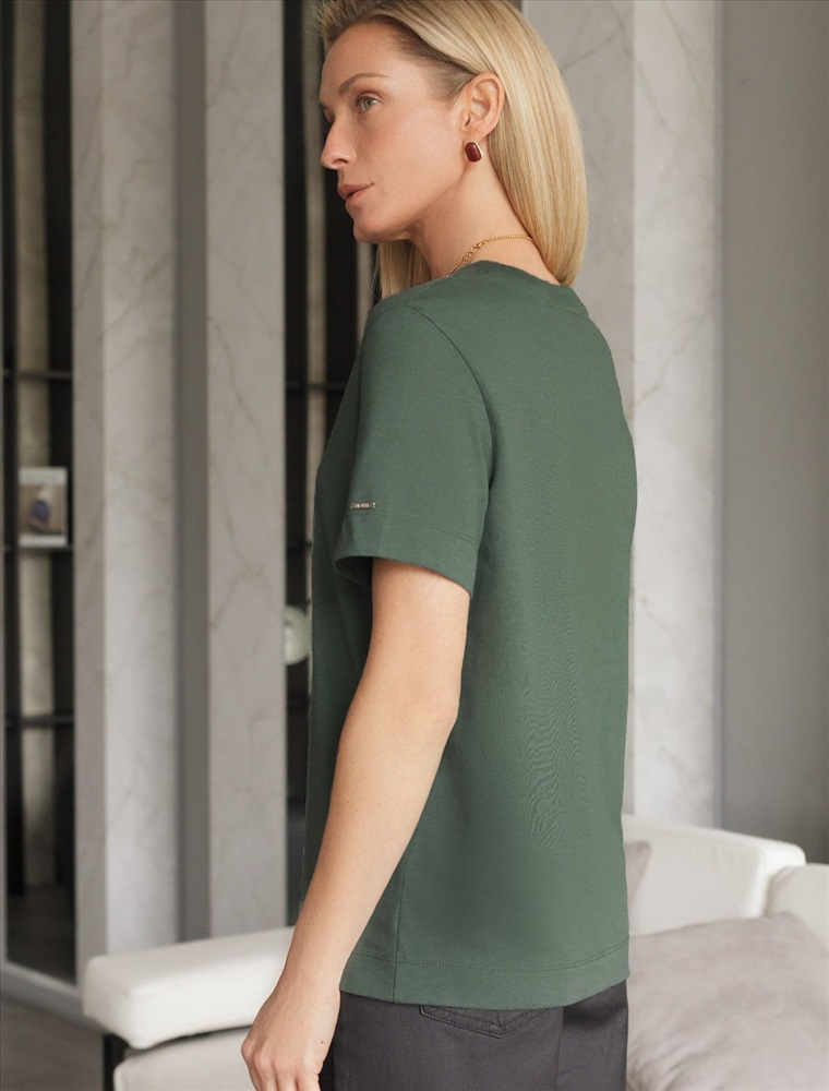 Параметры модели на первом фото: Рост 172, бюст 88, талия 64, бедра 88 Базовая однотонная футболка из премиального хлопка. Горловина выполнена из рибаны в тон изделия, Добавление эластана в состав изделия способствует формоустойчивости. Самое высокое качество хлопковых волокон обеспечивает комфорт в любое время года. Идеально держит форму и сохраняет внешний вид в течение долговременного использования. Универсальная базовая вещь для ваших стилистических решений. Изделие дополнено металлическим логотипом бренда на рукаве.