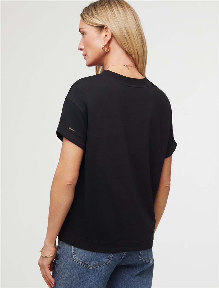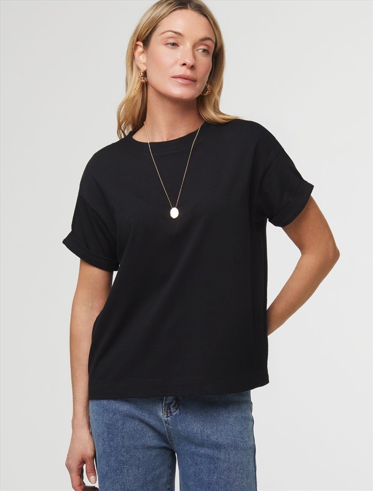 Базовая однотонная футболка из премиального хлопка. Горловина выполнена из рибаны в тон изделия, Рукава с подворотами и золотистым логотипом бренда из металла. Добавление эластана в состав изделия способствует формоустойчивости. Самое высокое качество хлопковых волокон обеспечивает комфорт в любое время года. Идеально держит форму и сохраняет внешний вид в течение долговременного использования. Универсальная базовая вещь для ваших стилистических решений.