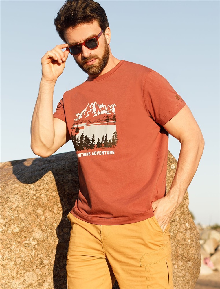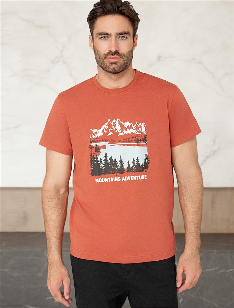 Перевод принта: Mountains adventure - приключение в горах. Футболка выполнена из премиального хлопка с эластаном. Авторский принт нанесен фактурными красками с устойчивым покрытием. Изделие комфортно сидит по фигуре, не сковывая движений. За счет среднего объема, хорошо подойдет как первый слой под пиджак, кардиган или бомбер. На рукаве нашивка из эко-кожи с логотипом бренда.