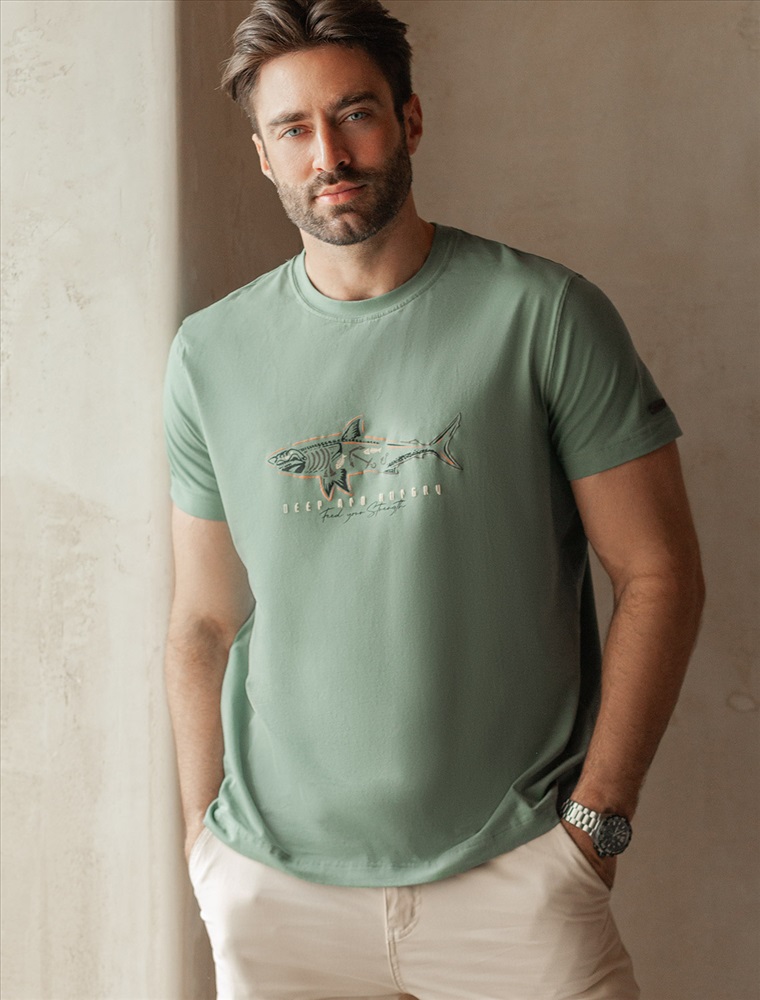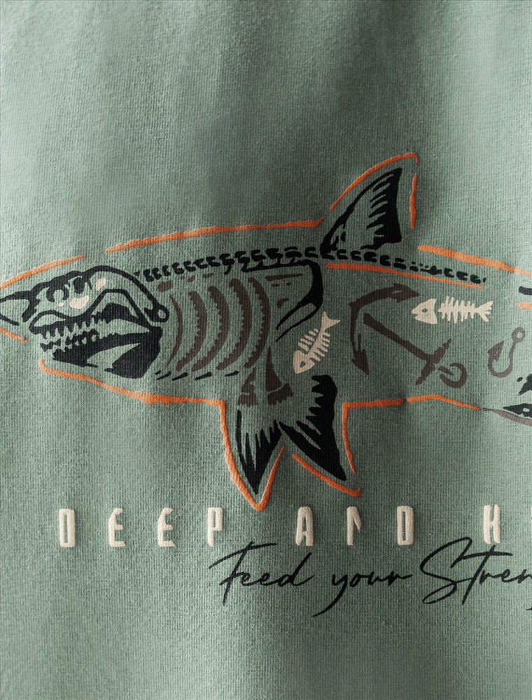 Параметры модели на первом фото: Рост 190, бюст 108, талия 87, бедра 104 Перевод принта: deep and hungry, feed your strength - голодный обитатель глубин, укрепляй свою силу. Футболка выполнена из премиального хлопка с эластаном. Авторский принт нанесен фактурными красками с устойчивым покрытием. Изделие комфортно сидит по фигуре, не сковывая движений. За счет среднего объема, хорошо подойдет как первый слой под пиджак, кардиган или бомбер. На рукаве нашивка из эко-кожи с логотипом бренда.