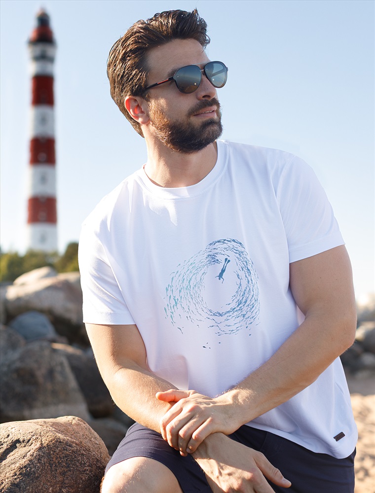 Плотность: 170 Г/м2 Параметры модели на первом фото: Рост 190, бюст 108, талия 87, бедра 104 Футболка выполнена из премиального хлопка с эластаном. Авторский принт нанесен фактурными красками с устойчивым покрытием. Изделие комфортно сидит по фигуре, не сковывая движений. За счет среднего объема, хорошо подойдет как первый слой под пиджак, кардиган или бомбер. На рукаве нашивка из эко-кожи с логотипом бренда. Комментарии к товару