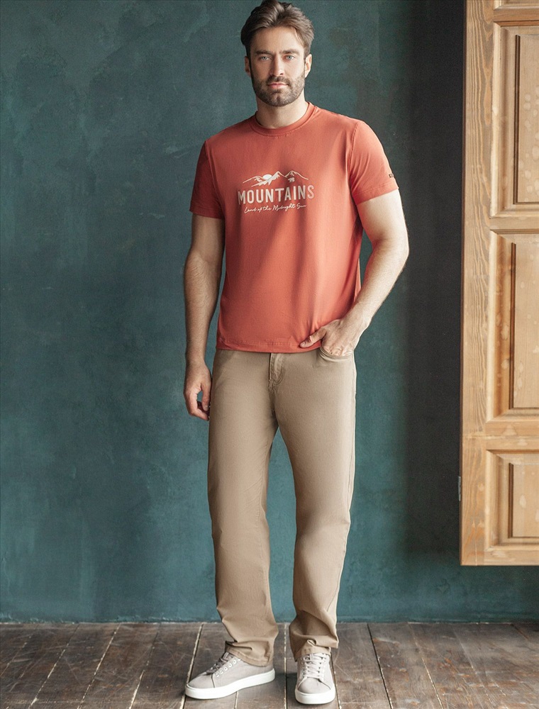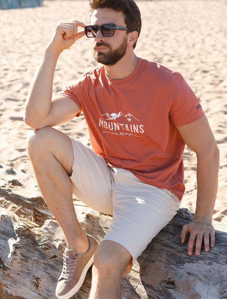 Перевод принта: Mountains, land of the midnight sun - горы - страна полуночного солнца. Футболка выполнена из премиального хлопка с эластаном. Авторский принт нанесен фактурными красками с устойчивым покрытием. Изделие комфортно сидит по фигуре, не сковывая движений. За счет среднего объема, хорошо подойдет как первый слой под пиджак, кардиган или бомбер. На рукаве нашивка из эко-кожи с логотипом бренда.