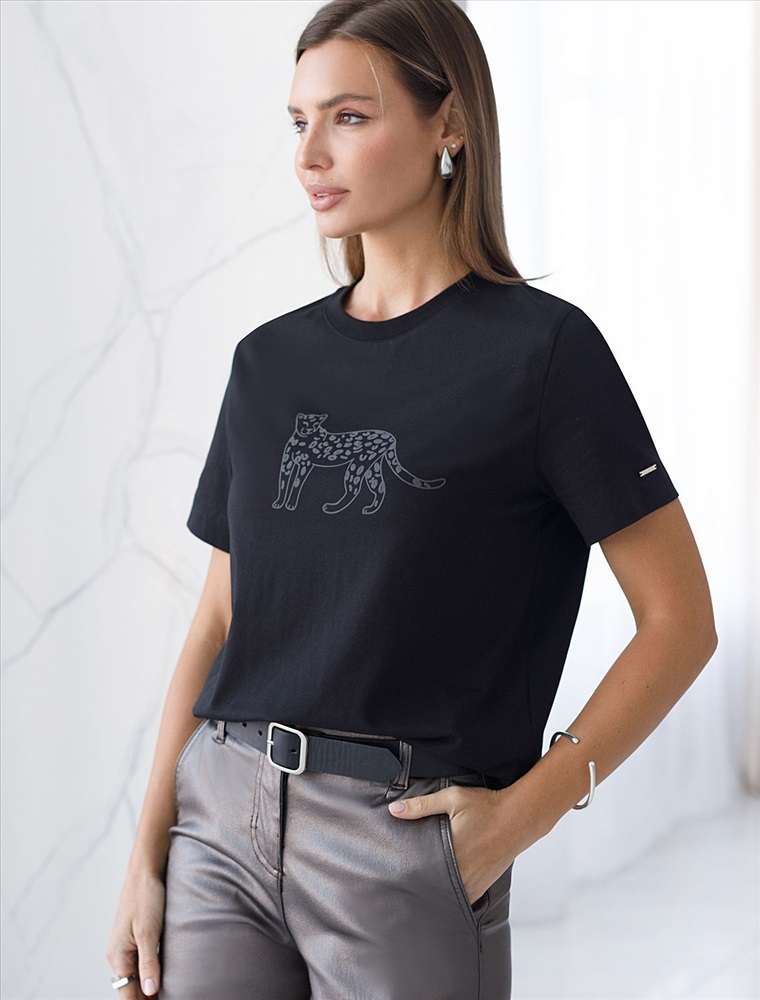 Плотность: 170 Г/м2 Футболка выполнена из премиального хлопка.Принт "леопард" нанесен фактурными красками с устойчивым покрытием. Наличие эластана в составе гарантирует комфорт и формоустойчивость. Изделие дополнено фирменным металлическим логотипом бренда. Комментарии к товару