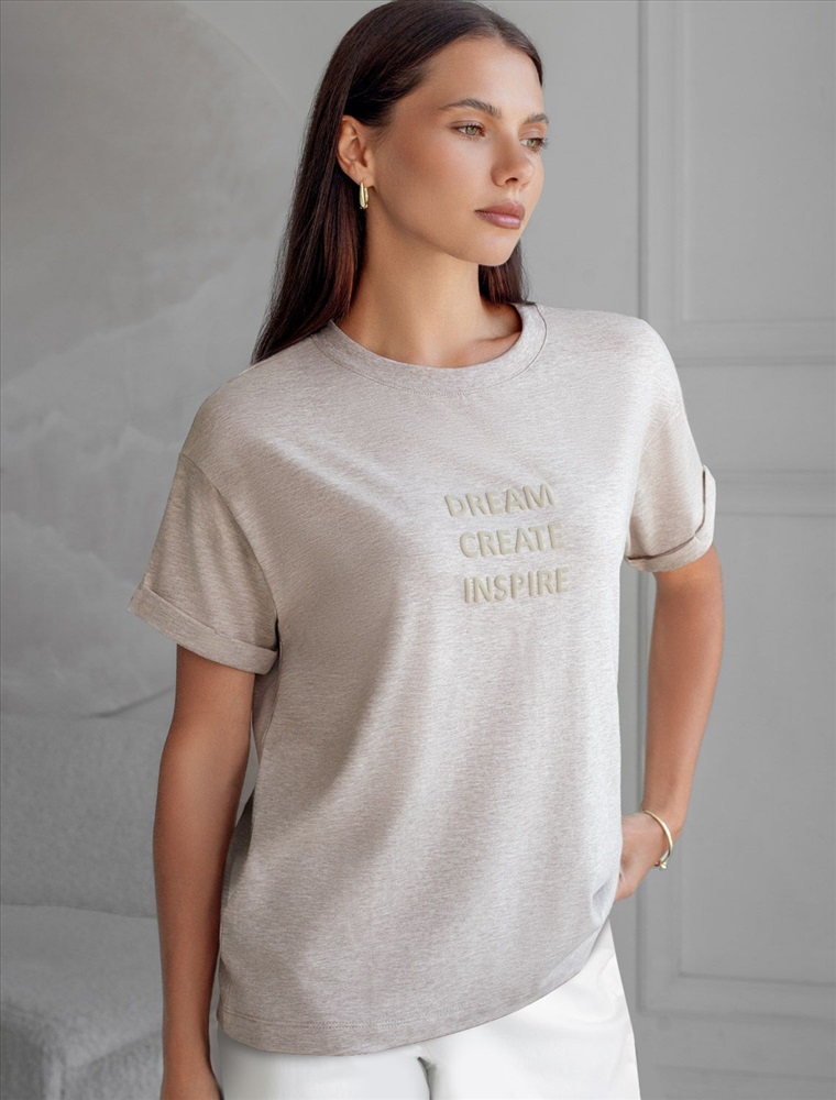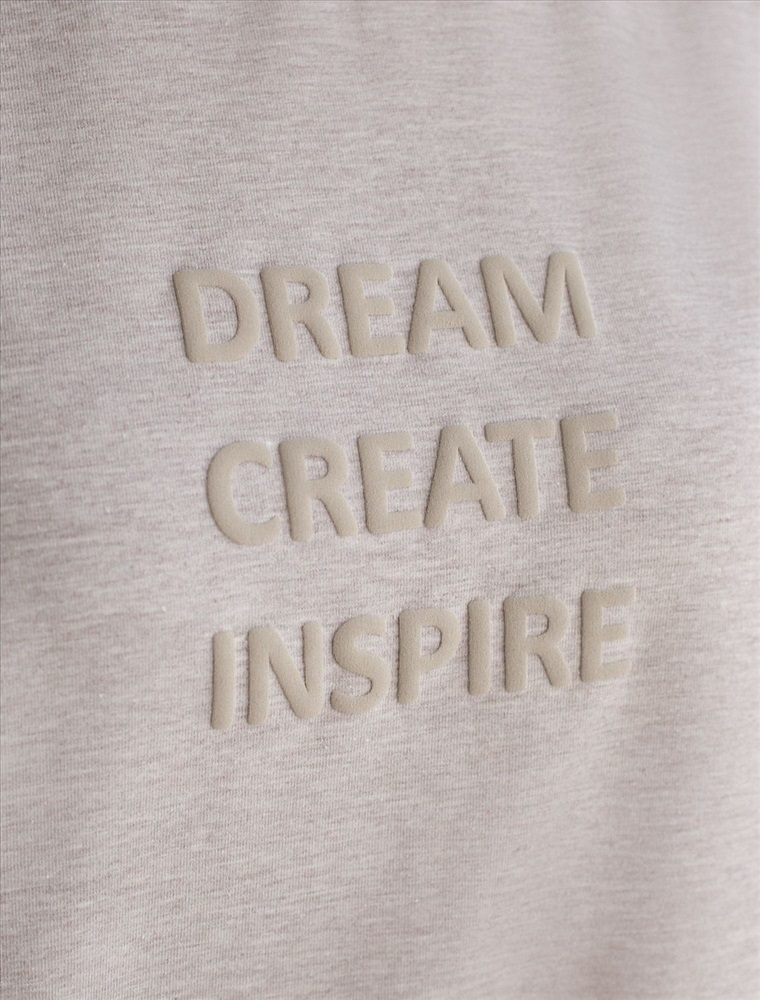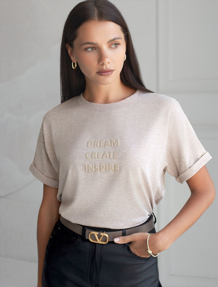 Плотность: 170 Г/м2 Перевод принта: Dream, create, inspire — мечтай, создавай, вдохновляй Футболка из премиального хлопка, высокое качество хлопковых волокон обеспечивает комфорт в любое время года. Горловина выполнена из рибаны в тон изделия, Рукава с подворотами и золотистым логотипом бренда. Авторский принт нанесен фактурными красками с устойчивым покрытием. За счет эластана в составе идеально держит форму и сохраняет внешний вид в течение долговременного использования. Универсальная вещь для ваших стилистических решений.