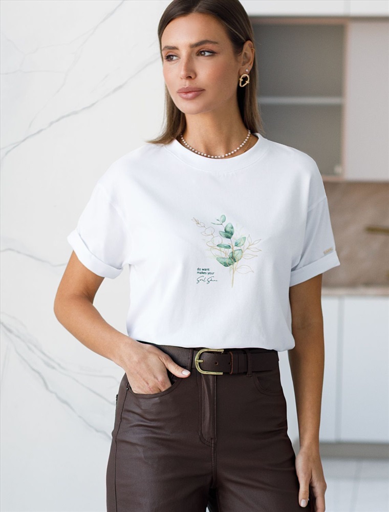 Плотность: 170 Г/м2 Перевод принта: do what makes your soul shine — делай то, что заставляет тебя сиять. Футболка из премиального хлопка, высокое качество хлопковых волокон обеспечивает комфорт в любое время года. Горловина выполнена из рибаны в тон изделия, Рукава с подворотами и золотистым логотипом бренда. Авторский принт нанесен фактурными красками и фольгой с устойчивым покрытием. За счет эластана в составе идеально держит форму и сохраняет внешний вид в течение долговременного использования. Универсальная вещь для ваших стилистических решений. Комментарии к товару