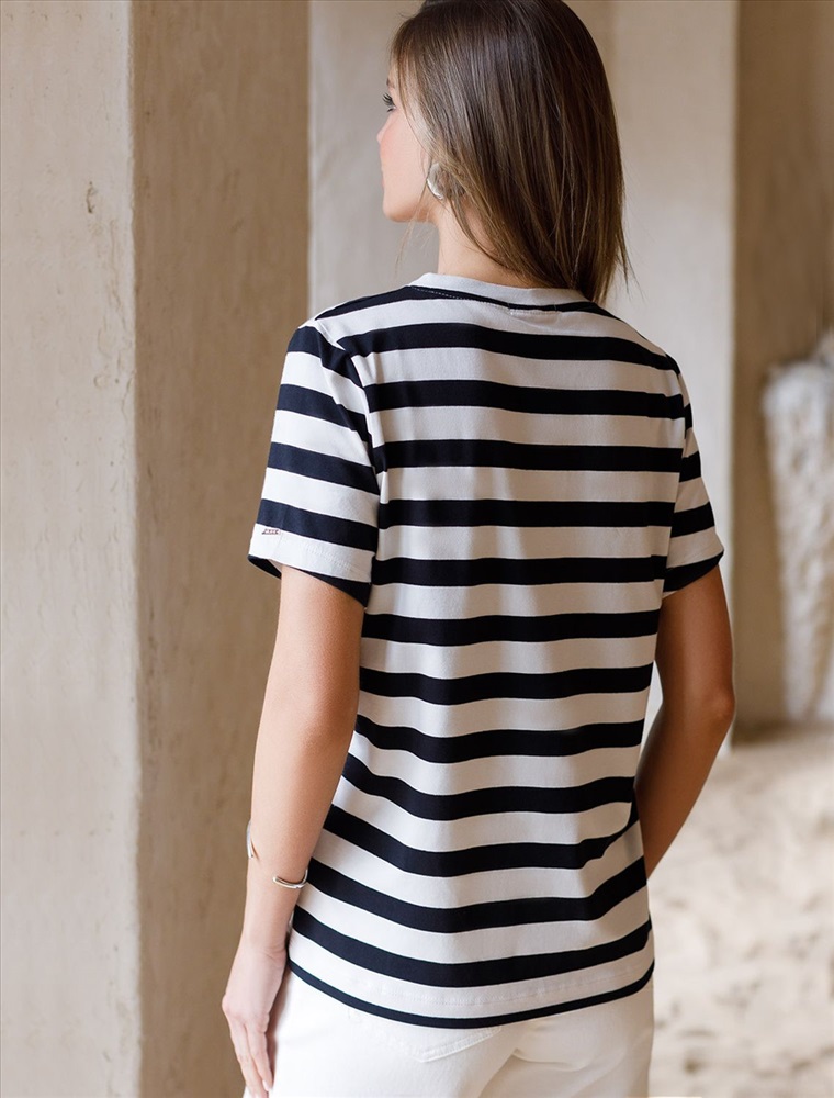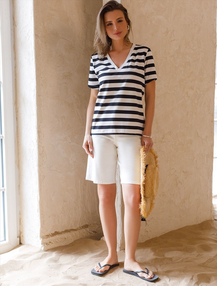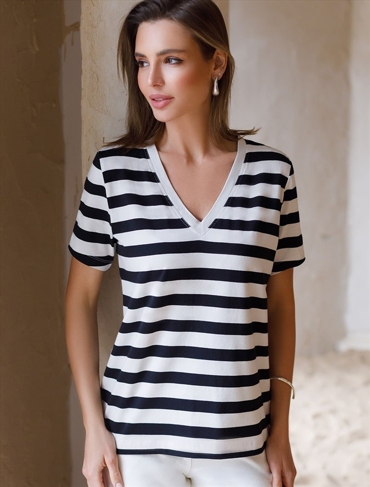 Размер товара на первом фото: 42 Футболка выполнена из премиального хлопка. Базовая модель с V-вырезом впишется в любой гардероб в любом сезоне. Наличие эластана в составе изделия гарантирует комфорт и формоустойчивость. На рукаве металлический логотип бренда.