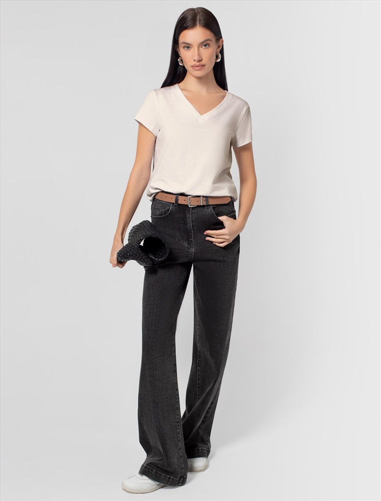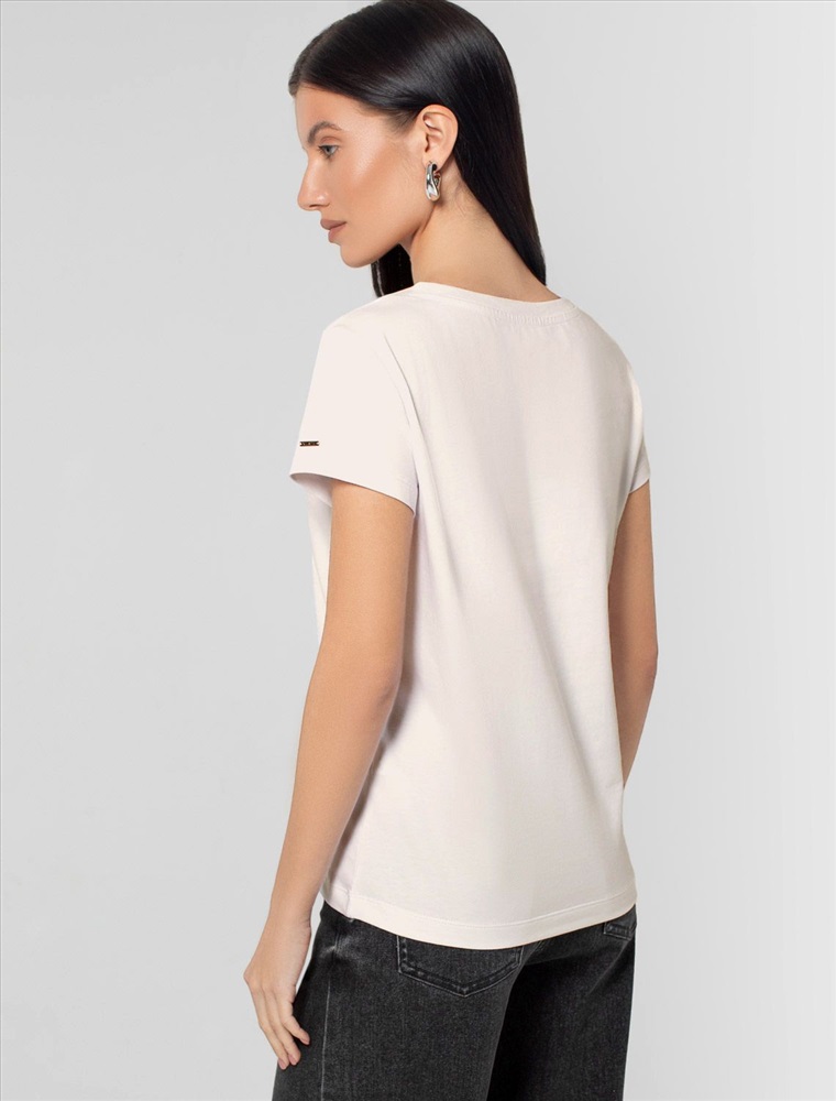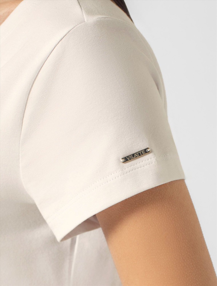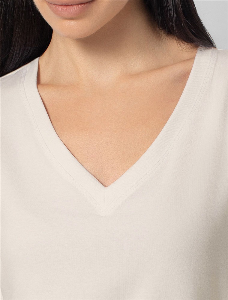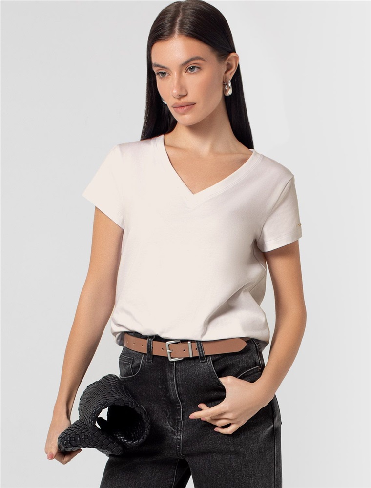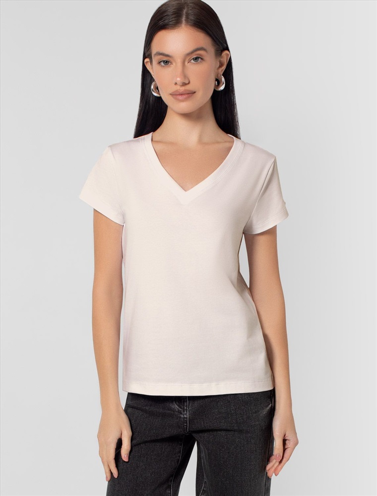 Плотность: 170 Г/м2 Параметры модели на первом фото: Рост 172, бюст 88, талия 64, бедра 88 Однотонная футболка с V-образным вырезом выполнена из премиального хлопка. Добавление эластана в состав изделия способствует формоустойчивости. Самое высокое качество длинноволокнистых хлопковых волокон обеспечивает комфорт в любое время года. Совет стилиста: очищенная от декора базовая модель будет уместна не только в повседневном образе с денимом, но и в офисе с нестрогим дресс-кодом, в паре с брюками и жакетом. Комментарии к товару