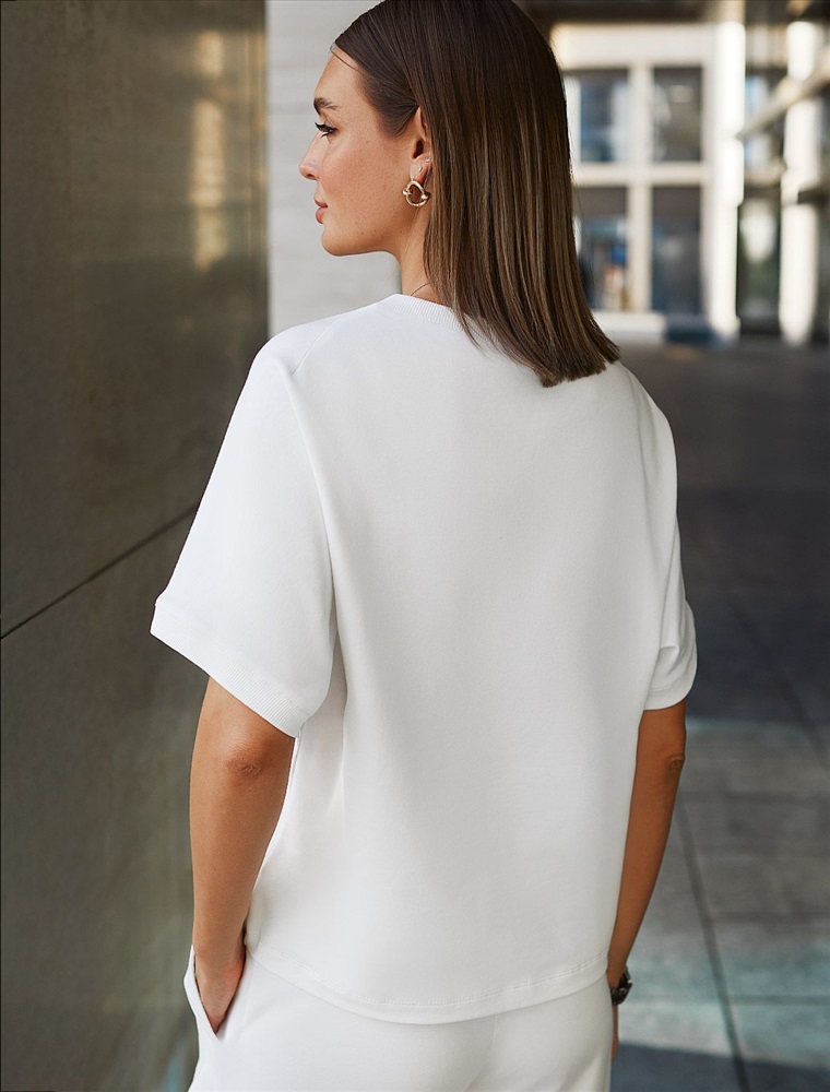 Плотность: 240 Г/м2 Параметры модели на первом фото: Рост 170, бюст 89, талия 63, бедра 92 Футболка белого цвета свободного кроя выполнена из премиального футера двухнитки с эластаном плотностью 240 Г/м2. . Натуральный материал отличается мягкостью и приятной текстурой, позволяя коже дышать и обеспечивая максимальное удобство при носке. Наличие эластана в составе изделия гарантирует абсолютный комфорт и формоустойчивость. Круглый ворот, рукава регланы средней длины и спущенная линия плеча придают футболке стильный и современный вид, делают образ расслабленным и непринужденным, такой вариант отлично сядет на большие размеры. Плотная футболка идеально подходит для повседневной носки и незаменима для тех, кто ценит удобство и свободу движений без компромиссов по стилю. Комментарии к товару