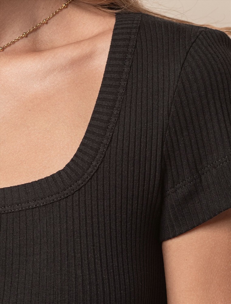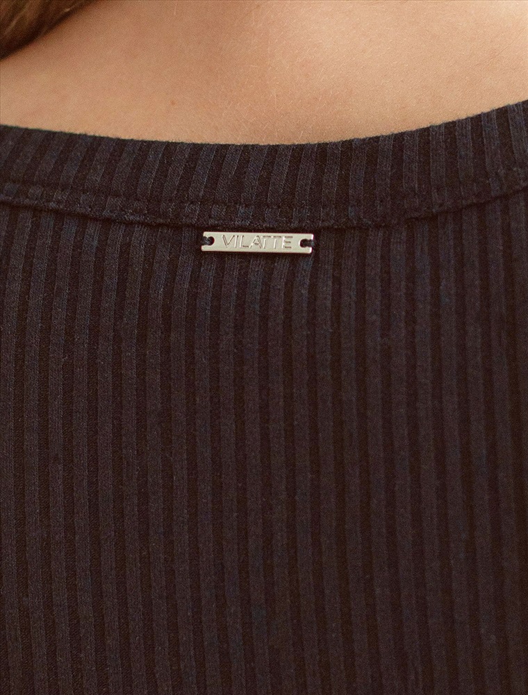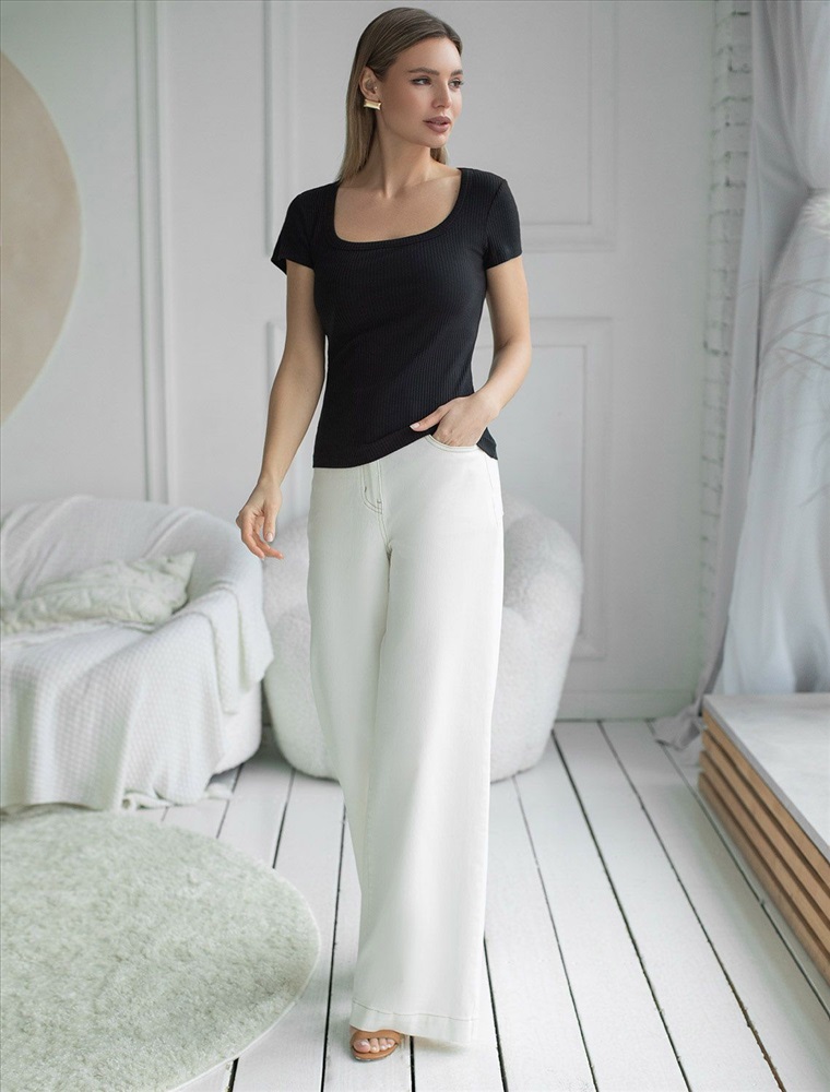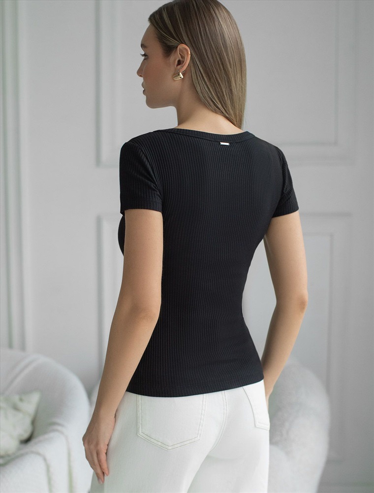 Футболка выполнена из трикотажа в широкий рубчик. Приятная к телу хлопковая ткань с гладкой трикотажной фактурой. Вырез каре подчеркивает изящество фигуры с акцентом на декольте и поддерживает силуэт. Лучшее решение для комплектов с акцентом на талию с объемными низами – палаццо, кюлотами или пышными юбками. Изделие украшено фирменным логотипом бренда.
