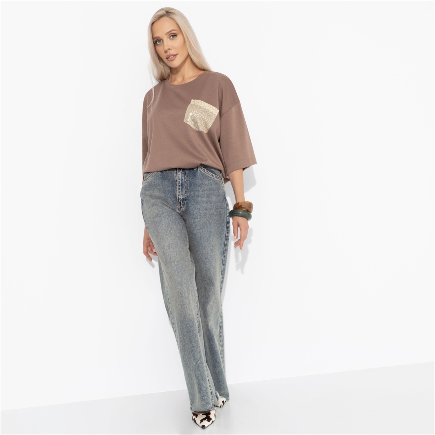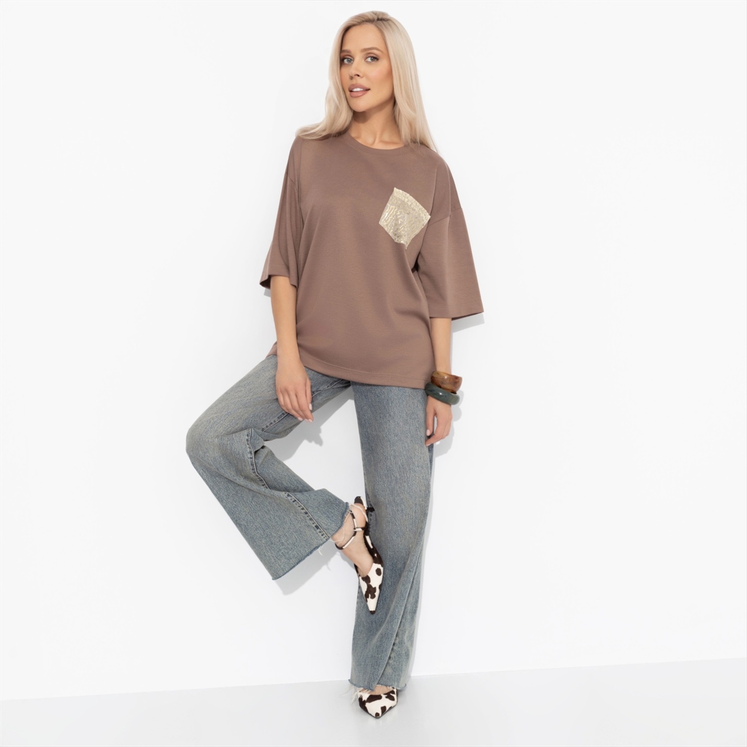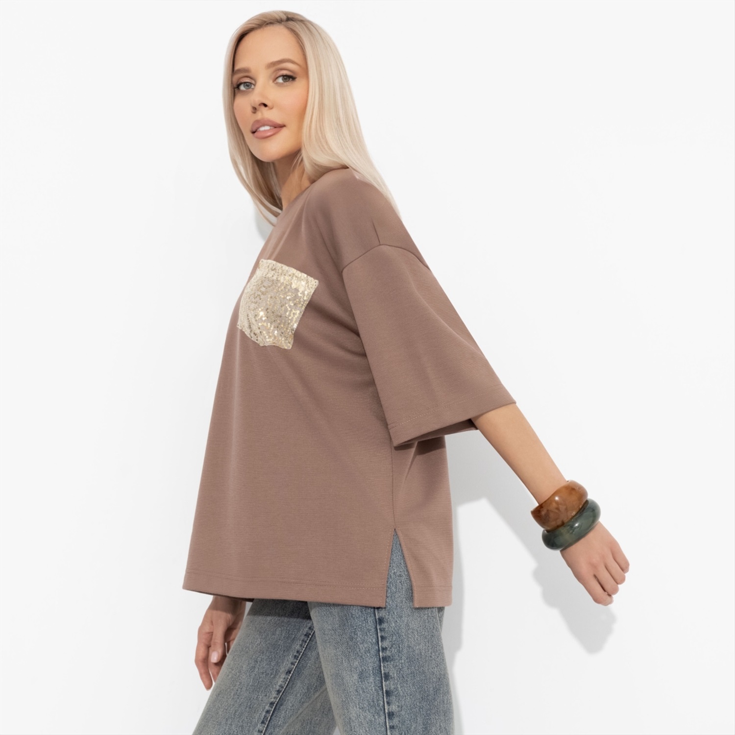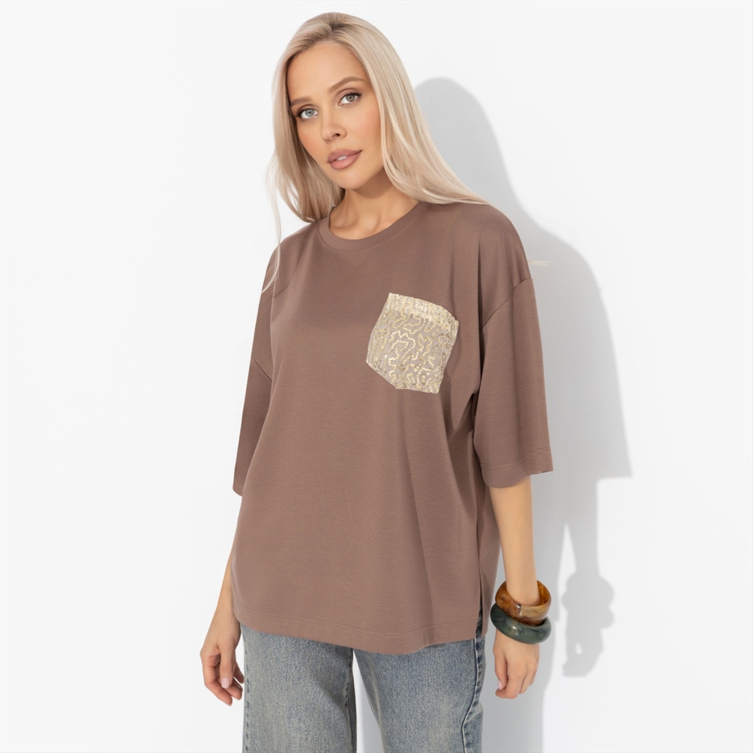 Состав: «Милано» (65% полиэстер, 30% вискоза, 5% стрейч) Плотность ткани: Средняя Тип ткани: Трикотаж Вид застежки: Нет Декоративные элементы: Пайетки Дополнительный цвет ткани: Золотой Карманы: Накладные Основной цвет ткани: Коричневый Отрезная талия: Нет Подклад: Нет Резинка по талии: Нет Рисунок/раппорт: Каждое изделие уникально из-за расположения рисунка на ткани Сезон: Круглогодичный Силуэт: Свободный Стиль: Повседневный Параметры модели на фото: