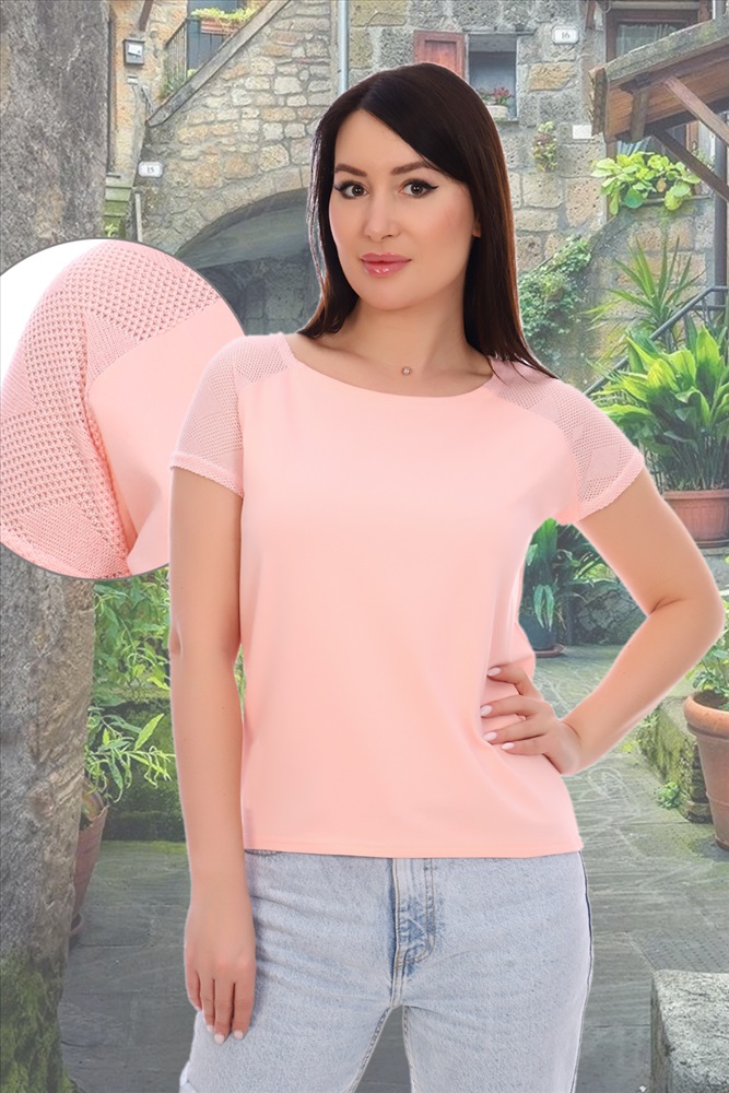 Стиль: молодежный | повседневный Футболка женская свободного покроя из комбинированного трикотажного полотна - кулирки с лайкрой ПЕНЬЕ и ажурного трикотажа. Спущенная пройма, реглан из ажурного трикотажа, вырез горловины в виде лодочки, низ спинки слегка удлинён и закруглён. Кулирка с лайкрой ПЕНЬЕ это эластичный , гладкий, приятный к телу, высококачественный трикотаж. Преимущества кулирки ПЕНЬЕ: воздухопроницаемость, гипоаллергенность, не образуются катышки .