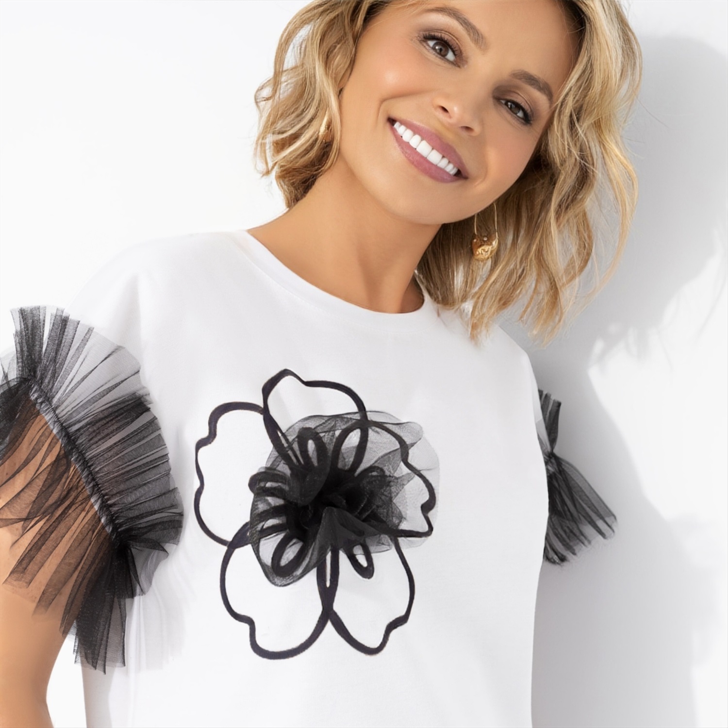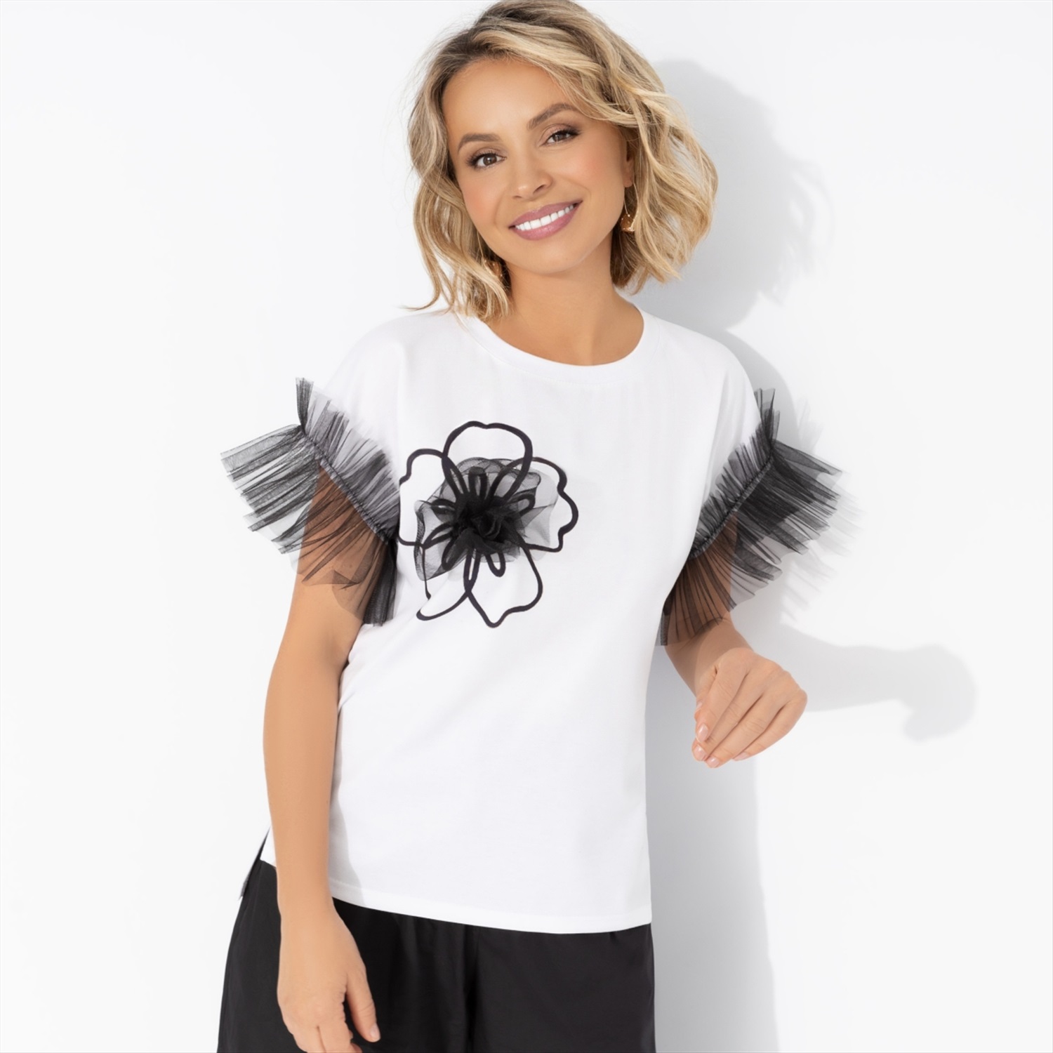 Состав: Милано (65% п/э, 30% вискоза, 5% стрейч) Плотность ткани: Средняя Тип ткани: Трикотаж Вид застежки: Нет Декоративные элементы: Рюши Дополнительный цвет ткани: Черный Карманы: Нет Основной цвет ткани: Белый Отрезная талия: Нет Подклад: Нет Резинка по талии: Нет Рисунок/раппорт: Каждое изделие уникально из-за расположения рисунка на ткани Сезон: Круглогодичный Силуэт: Прямой Стиль: Повседневный Параметры модели на фото: