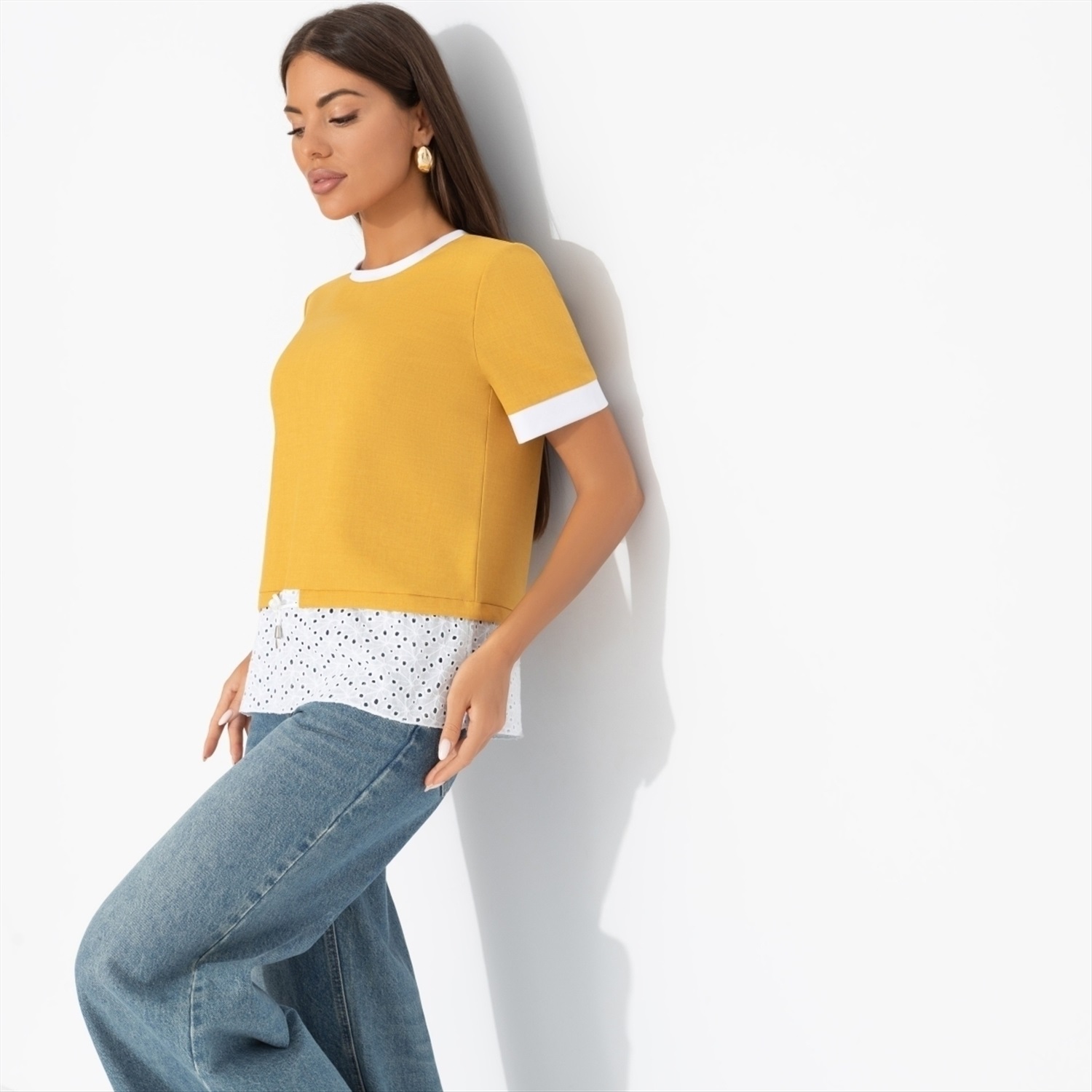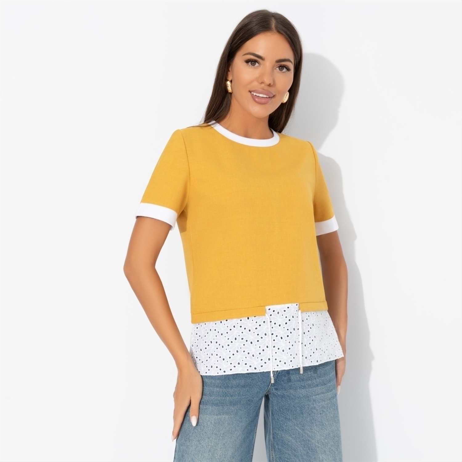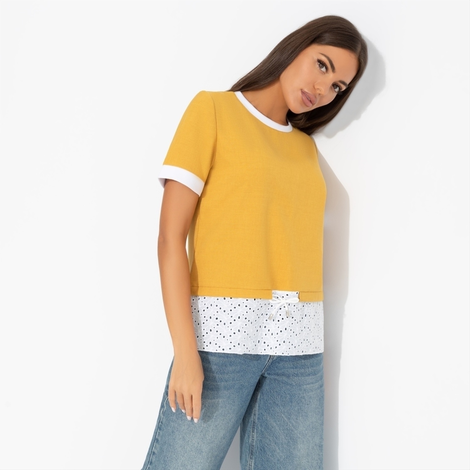 Состав: Лён «тайвань», хлопок шитьё (80% п/э, 15% лен, 5% эластан) Плотность ткани: Средняя Тип ткани: Текстиль Вид застежки: Нет Декоративные элементы: Завязки Дополнительный цвет ткани: Белый Карманы: Нет Основной цвет ткани: Жёлтый Отрезная талия: Есть Подклад: Нет Резинка по талии: Нет Рисунок/раппорт: Нет, все изделия идентичны Сезон: Круглогодичный Силуэт: Прямой Стиль: Повседневный Параметры модели на фото: