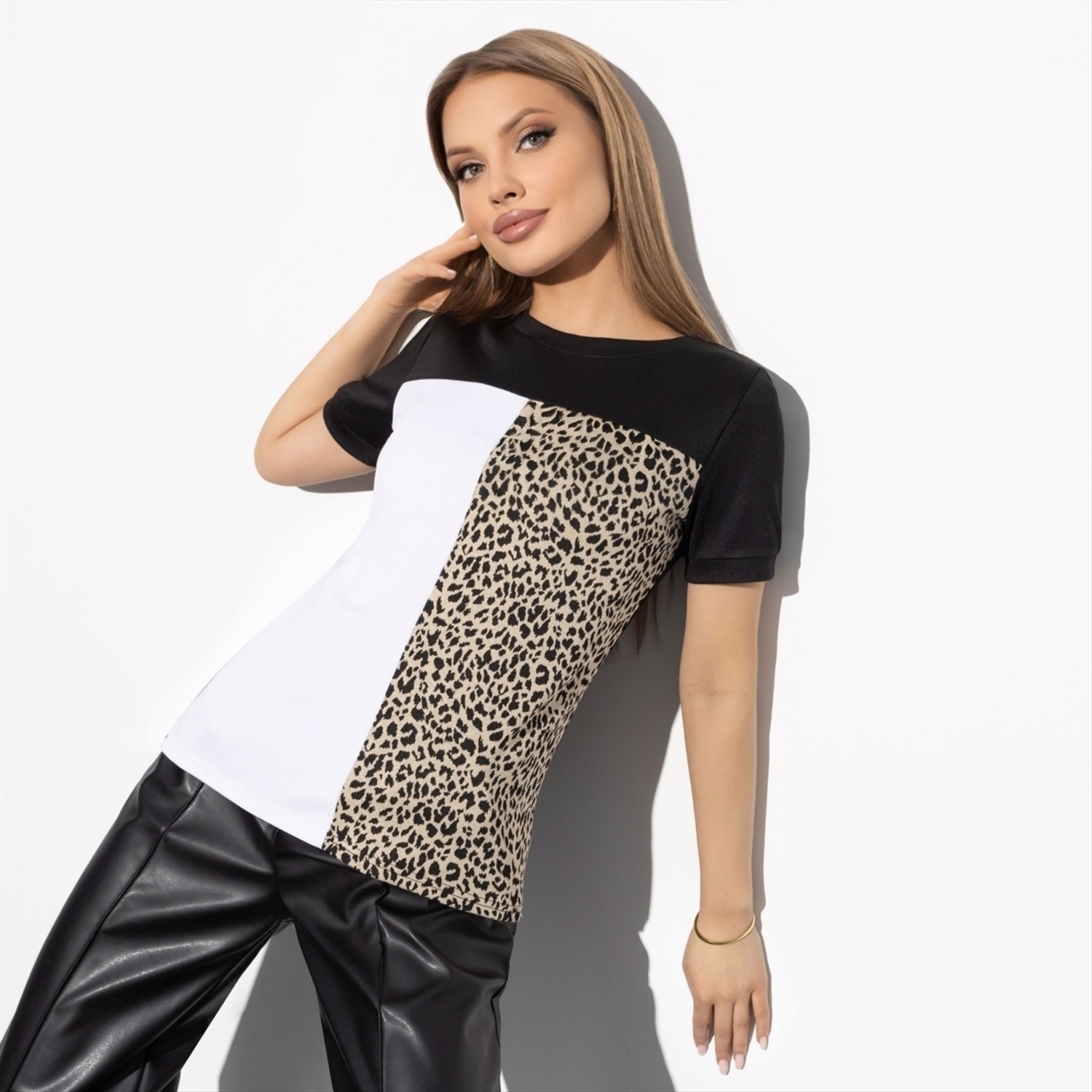 Эта футболка излучает изысканность и элегантность, которая подчеркнет ваш неповторимый стиль. Ее утонченная текстура, созданная из сочетания трикотажей «милано» и «набивной», обеспечивает комфорт при носке и приятные тактильные ощущения. Надевайте эту футболку для создания утонченного образа, который привлечет восхищенные взгляды на любом мероприятии. С этой футболкой вы сможете легко адаптировать свой образ к различным ситуациям. Будь то повседневные прогулки или вечерние свидания, вы всегда будете выглядеть стильно и уверенно. Сочетайте ее с джинсами для кэжуал-лука или с элегантной юбкой для создания более формального стиля. Эта футболка станет незаменимой частью вашего гардероба, подчеркивая вашу уникальность в любой ситуации. Будьте настоящей фэшн-иконой, выражая свою индивидуальность через стиль с этой футболкой. Она поможет вам подчеркнуть светлую, темную и даже леопардовую стороны вашей личности. Сделайте смелый шаг в мир моды, выбрав эту уникальную модель для экспериментов с вашим образом.