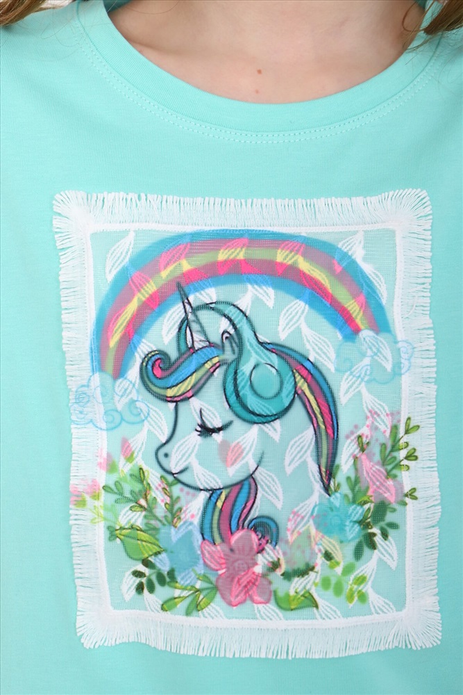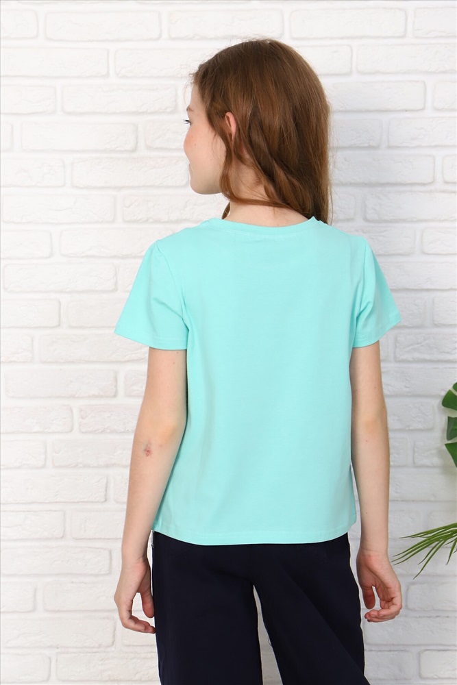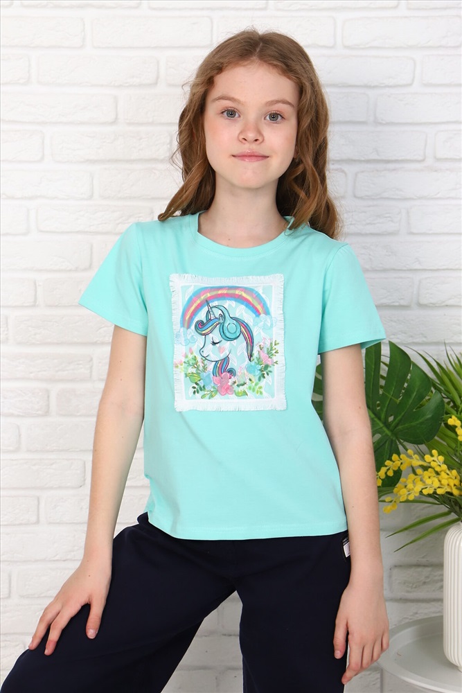 Футболка для девочек дошкольного и младшего школьного возраста, из однотонного трикотажного полотна кулирка с лайкрой. Футболка прямого силуэта, с втачным рукавом, с обтачкой в горловине. Спереди и на спинке отсутствуют линии членения. Рукав одношовный. Низа рукавов и изделия подогнуты. По шву втачивания обтачки в горловину проложена отделочная строчка. Спереди настрочена декоративная нашивка.