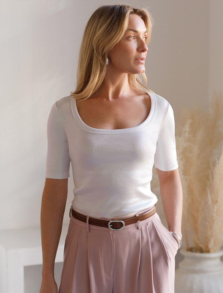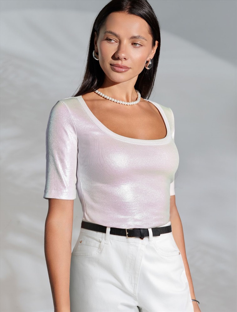 Плотность: 175 Г/м2 Стильная футболка перламутрового цвета с U вырезом выполнена из премиального хлопка с добавлением эластана. Эффектное матовое покрытие металлик придает футболке изысканный блеск. Чуть удлиненные рукава и глубокий круглый вырез, открывающий область декольте, добавляют женственность и элегантность образу. Мелкий рубчик визуально вытягивает силуэт, за счет эластана в составе материал прекрасно тянется и садится на любую фигуру, в том числе большие размеры. Ткань износостойкая, сохраняет свой превоначальный вид даже после многочисленных стирок, отличается мягкостью и приятными тактильными ощущениями, такой материал не раздражает кожу, дарит ощущение уюта даже при длительном ношении, а воздухопроницаемость позволяет коже свободно дышать. Повседневная футболка универсальна: она сочетается с джинсами, юбками или строгими брюками — легко создать как деловой образ для офиса, так и наряд для вечеринки или ужина вне дома. Матовое покрытие создает благородный блеск без лишней яркости, благодаря чему футболка смотрится свежо и актуально. Комментарии к товару