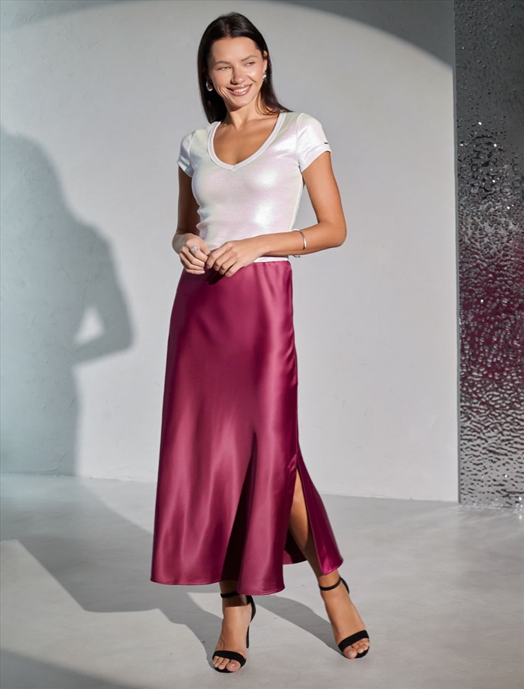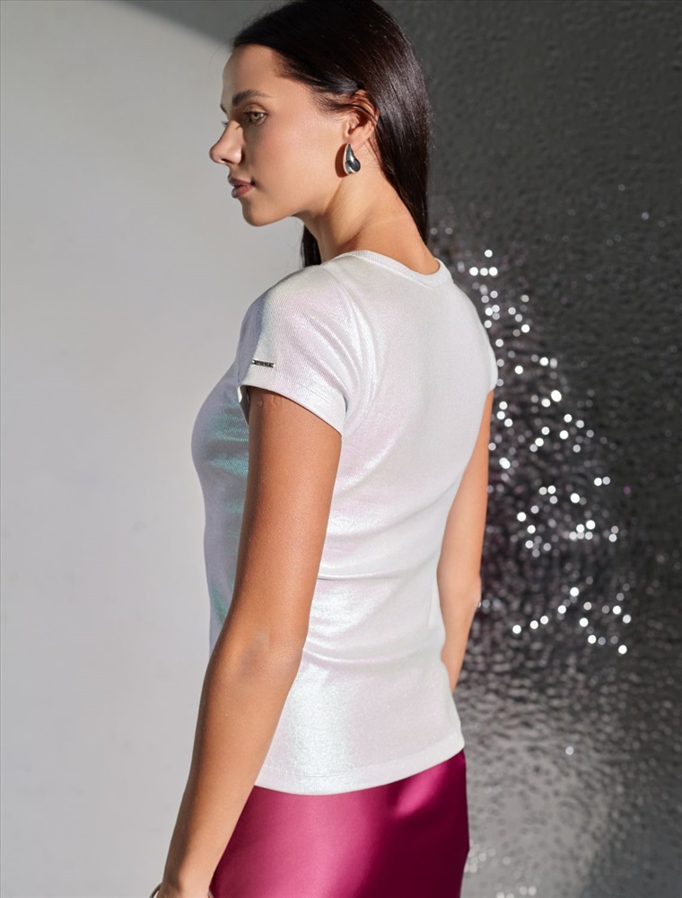 Повседневная футболка универсальна: она сочетается с джинсами, юбками или строгими брюками — легко создать как деловой образ для офиса, так и наряд для вечеринки или ужина вне дома. Матовое покрытие создает благородный блеск без лишней яркости, благодаря чему футболка смотрится свежо и актуально.