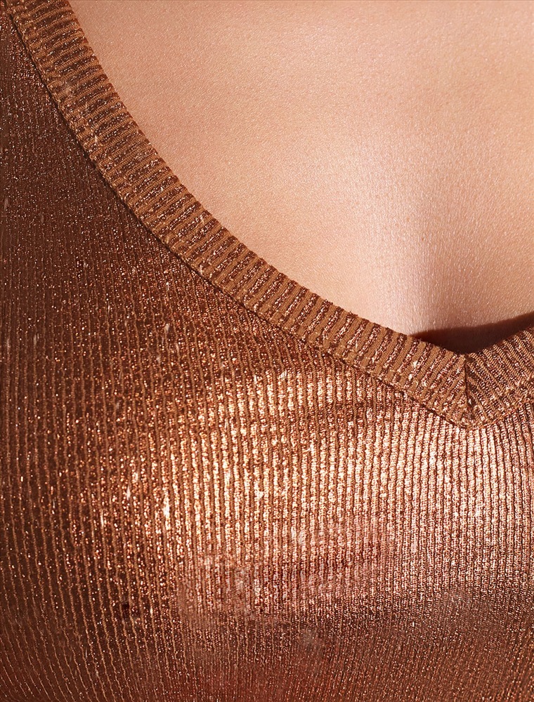 Стильная футболка кофейного цвета с V вырезом выполнена из премиального хлопка с добавлением эластана. Эффектное матовое бронзовое покрытие металлик с серебристыми вкраплениями придает футболке изысканный блеск. Чуть удлиненные рукава и глубокий вырез, открывающий область декольте, добавляют женственность и элегантность образу. Мелкий рубчик визуально вытягивает силуэт, за счет эластана в составе материал прекрасно тянется и садится на любую фигуру, в том числе большие размеры. Ткань износостойкая, сохраняет свой превоначальный вид даже после многочисленных стирок, отличается мягкостью и приятными тактильными ощущениями, такой материал не раздражает кожу, дарит ощущение уюта даже при длительном ношении, а воздухопроницаемость позволяет коже свободно дышать.