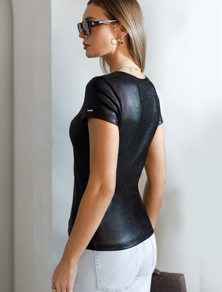 Плотность: 175 Г/м2 Стильная футболка черного цвета с V вырезом выполнена из премиального хлопка с добавлением эластана. Эффектное матовое покрытие металлик придает футболке изысканный блеск. Чуть удлиненные рукава и глубокий вырез, открывающий область декольте, добавляют женственность и элегантность образу. Мелкий рубчик визуально вытягивает силуэт, за счет эластана в составе материал прекрасно тянется и садится на любую фигуру, в том числе большие размеры. Ткань износостойкая, сохраняет свой превоначальный вид даже после многочисленных стирок, отличается мягкостью и приятными тактильными ощущениями, такой материал не раздражает кожу, дарит ощущение уюта даже при длительном ношении, а воздухопроницаемость позволяет коже свободно дышать. Повседневная футболка универсальна: она сочетается с джинсами, юбками или строгими брюками — легко создать как деловой образ для офиса, так и наряд для вечеринки или ужина вне дома. Матовое покрытие создает благородный блеск без лишней яркости, благодаря чему футболка смотрится свежо и актуально. Комментарии к товару
