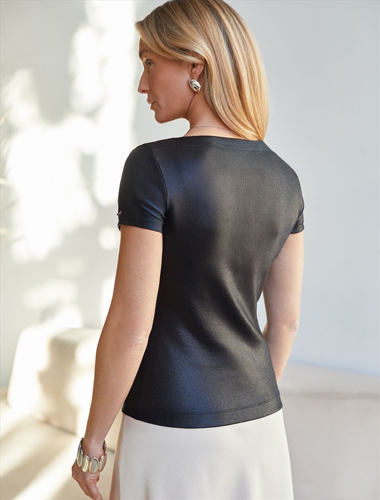 Повседневная футболка универсальна: она сочетается с джинсами, юбками или строгими брюками — легко создать как деловой образ для офиса, так и наряд для вечеринки или ужина вне дома. Матовое покрытие создает благородный блеск без лишней яркости, благодаря чему футболка смотрится свежо и актуально.