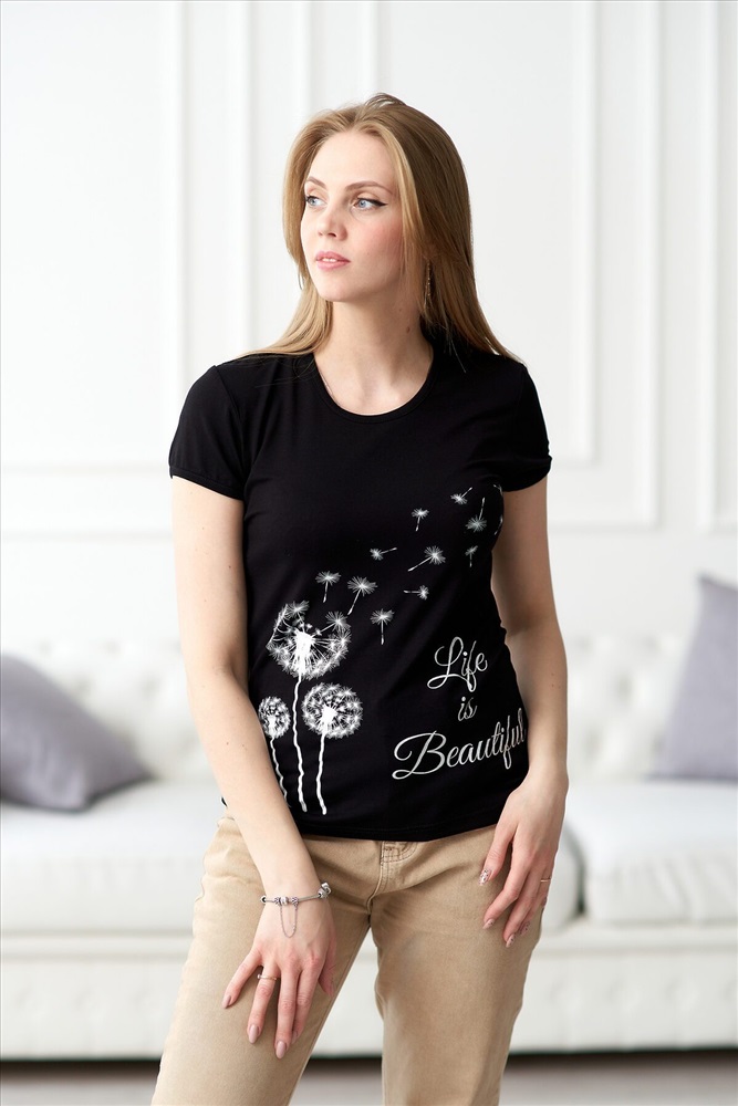 Страна производства: Россия Футболка женская полуприталенного силуэта, длиной до середины бедра. Вырез горловины округлый. Рукав втачной, короткий. Полочку футболки украшает принт.