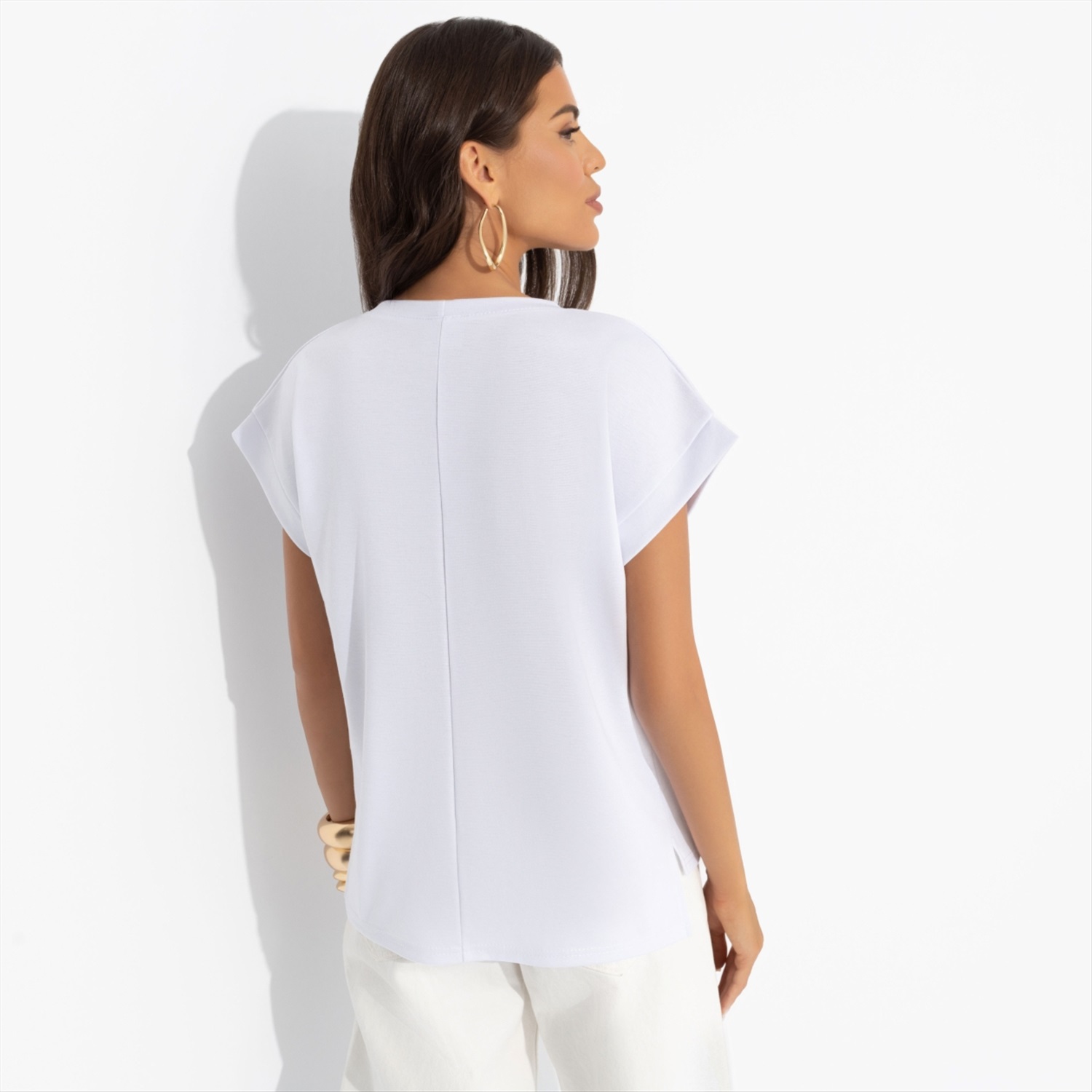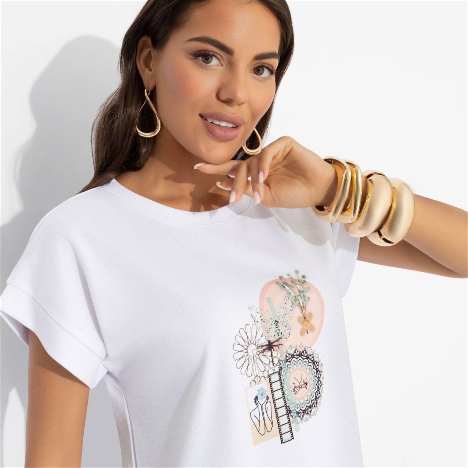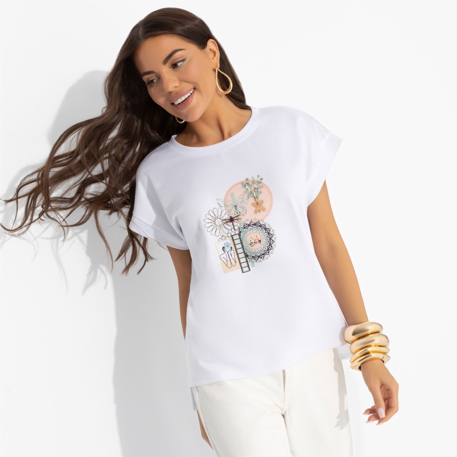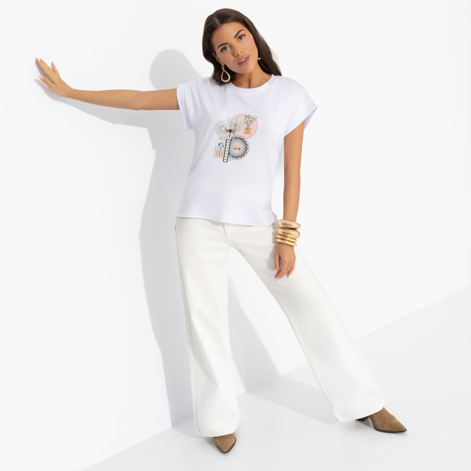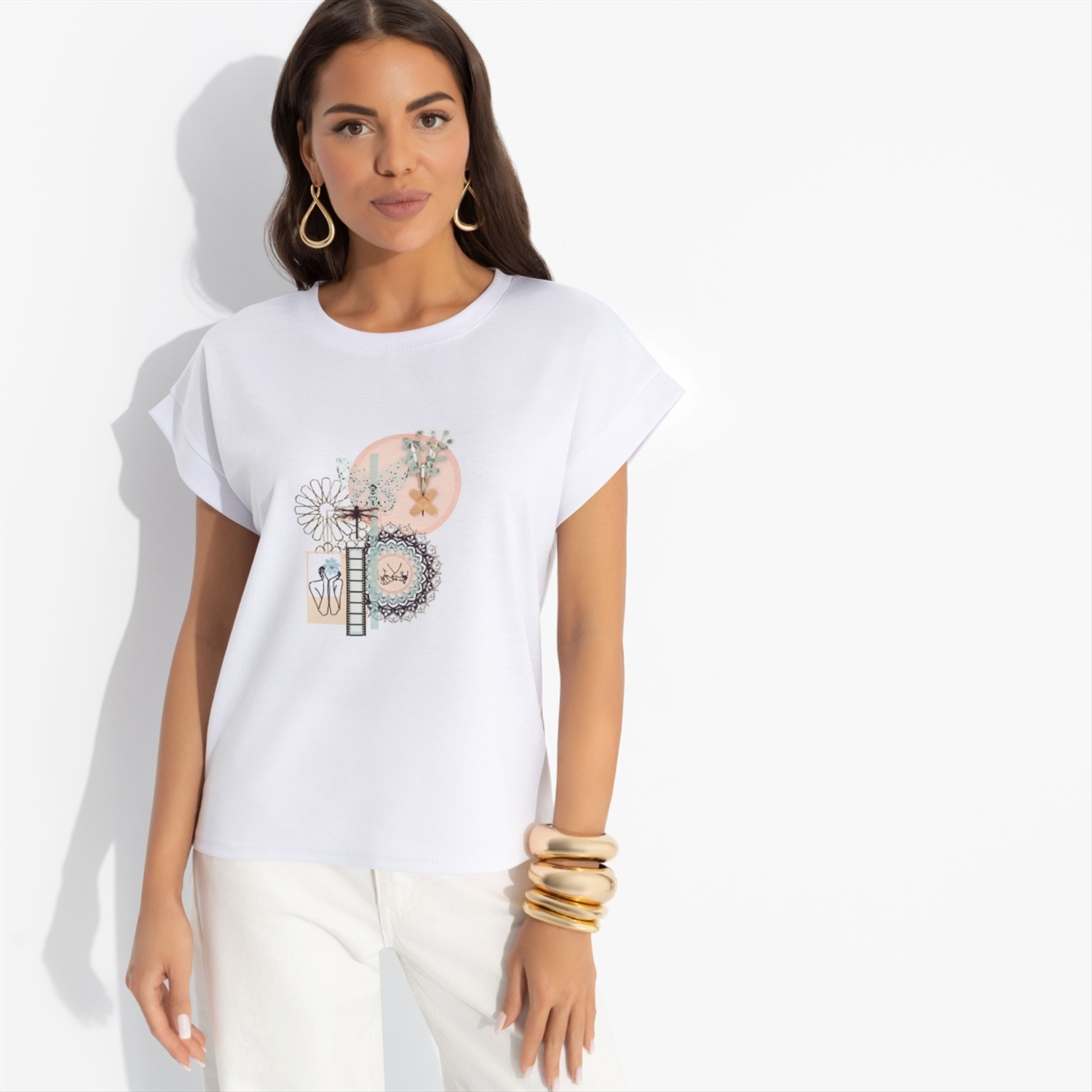 Состав: «Милано» (65% п/э, 30% вискоза, 5% стрейч) Плотность ткани: Средняя Тип ткани: Трикотаж Вид застежки: Нет Карманы: Нет Основной цвет ткани: Белый Отрезная талия: Нет Подклад: Нет Резинка по талии: Нет Рисунок/раппорт: Каждое изделие уникально из-за расположения рисунка на ткани Сезон: Круглогодичный Силуэт: Прямой Стиль: Повседневный Длина изделия: