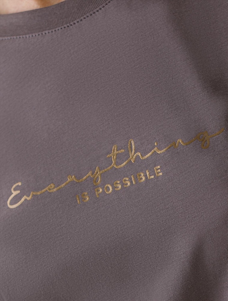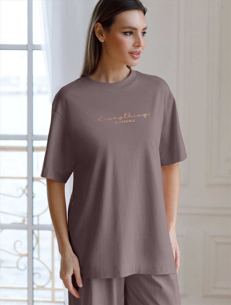 Плотность: 140 Г/м2 Оверсайз футболка кофейного цвета выполнена из премиального 100% хлопка плотностью 140 Г/м2. Главная особенность этого изделия — тонкое кулирное полотно, которое легче и воздушнее стандартного варианта. Благодаря своей деликатной текстуре футболка идеально подходит для домашних образов и пижамных комплектов. Ткань отлично дышит, обеспечивая максимальный уют во время сна и отдыха. Особое внимание привлекает стильный принт в виде надписи. Перевод надписи: Everything is possible - Все возможно. Принт выполнен красками с устойчивым покрытием, который добавляет футболке оригинальности и позволяет выразить индивидуальность. Свободный крой футболки дарит удобство и не стесняет движений, что делает ее идеальной для повседневной носки или активного отдыха, подчеркивает современный взгляд на моду. Подойдет девушкам и женщинам на любую фигуру, вы будете чувствовать себя в ней уверенно и комфортно. Отлично впишется в гардероб благодаря универсальному дизайну, который легко сочетать с любыми низами. Рекомендуем сочетать с артикулами: D44.163, D44.162, D44.161, D46.058, D48.011, D48.012 Комментарии к товару