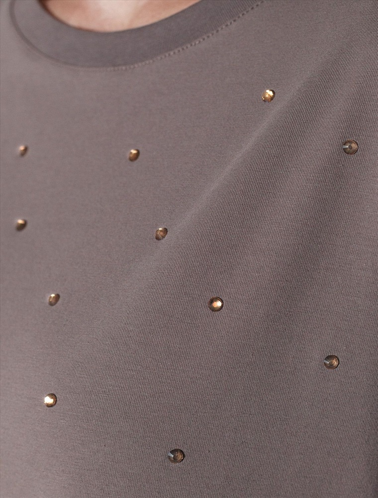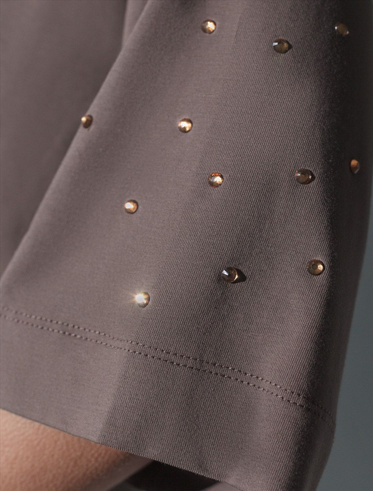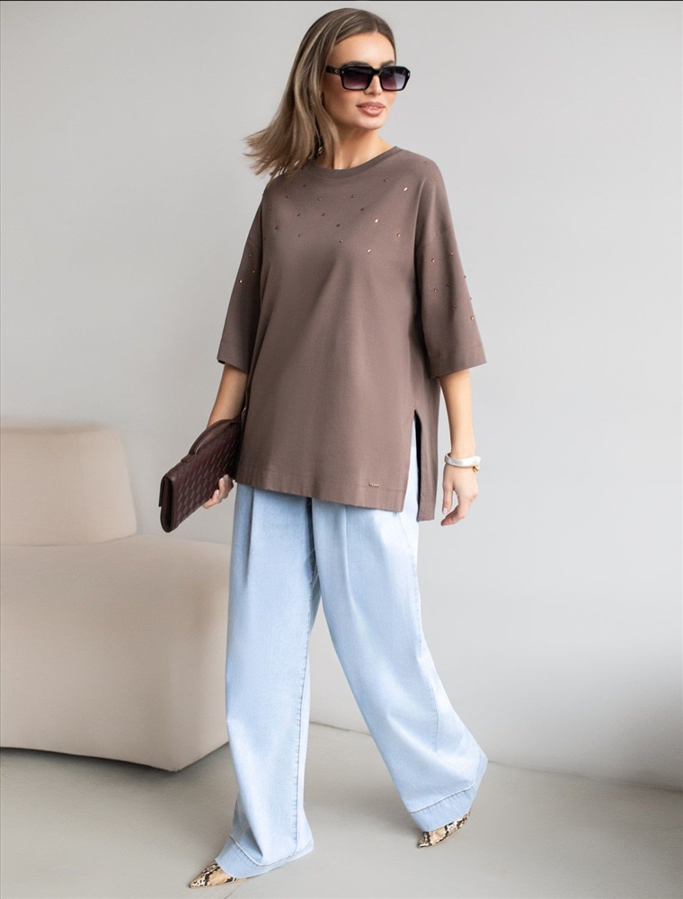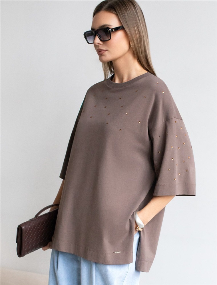 Плотность: 170 Г/м2 Оверсайз футболка кофейного цвета из премиального хлопка с добавлением эластана создана для комфорта и стиля каждый день. Натуральный материал приятный к телу, дышащая ткань хорошо держит форму и подходит для повседневной носки дома, в офисе или на прогулке. Классический свободный крой, удлиненный прямой силуэт и свободная посадка делают эту базовую футболку универсальным решением для любой фигуры и роста, включая плюс сайз размеры и беременных девушек, отлично скроет животик. Широкие рукава держвт форму и подойдут на полные руки. Нарядная футболка украшена авторским принтом в виде россыпи страз в тон основного полотна, которые создают красивый мерцающий эффект. Такой акцент делает модель уместной как для особых случаев, так и для ежедневных образов. Такая эффектная длинная футболка станет универсальным дополнением гардероба, позволяя создавать разнообразные образы с акцентом на современный стиль и утонченность деталей. Благодаря стильному дизайну с боковыми разрезами эта футболка станет идеальным вариантом для создания легких и непринужденных луков. Комментарии к товару