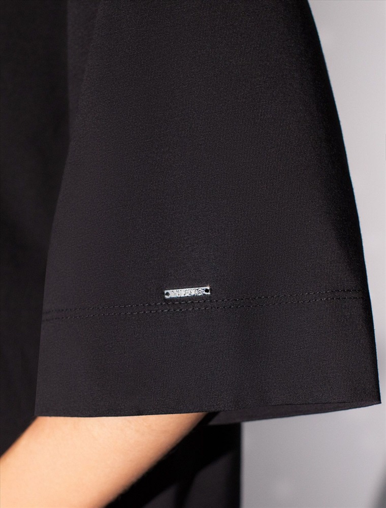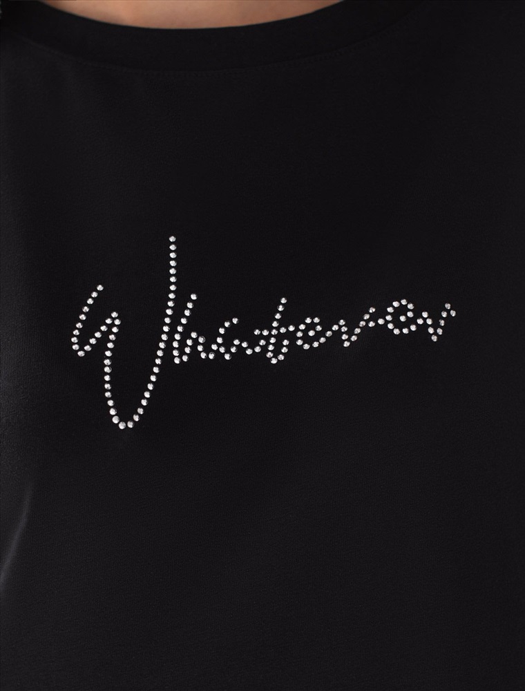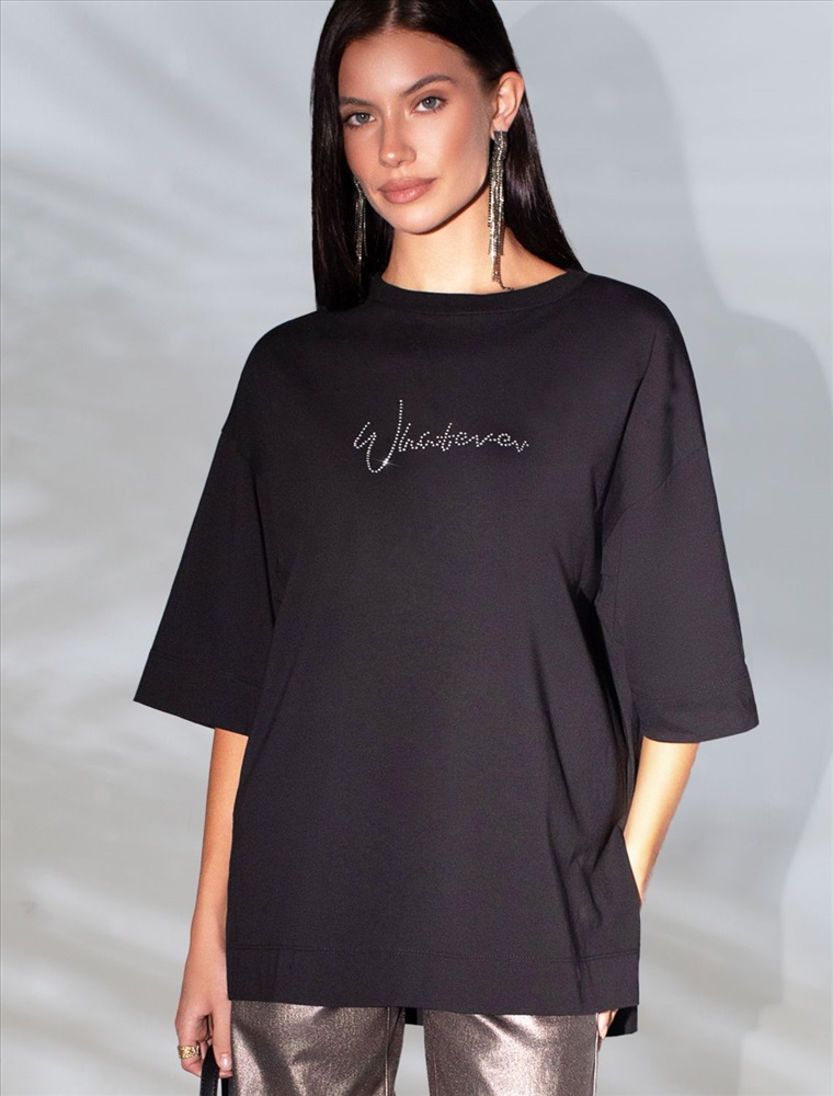 Оверсайз футболка черного цвета из премиального хлопка с добавлением эластана создана для комфорта и стиля каждый день. Натуральный материал приятный к телу, дышащая ткань хорошо держит форму и подходит для повседневной носки дома, в офисе или на прогулке. Классический свободный крой, удлиненный прямой силуэт и свободная посадка делают эту базовую футболку универсальным решением для любой фигуры и роста, включая плюс сайз размеры и беременных девушек, отлично скроет животик. Широкие рукава держат форму и подойдут на полные руки. Нарядная футболка украшена авторским принтом в виде надписи серебристыми стразами, которые создают красивый мерцающий эффект. Перевод надписи Whatever - Что бы ни... Такой акцент делает модель уместной как для особых случаев, так и для ежедневных образов.