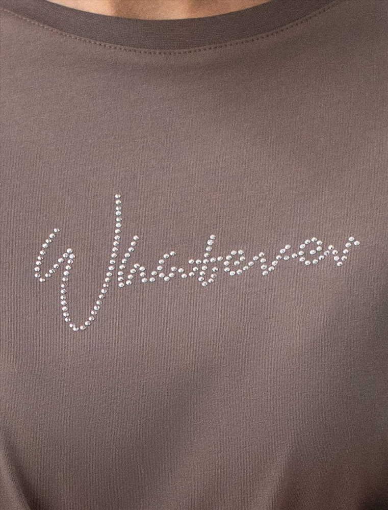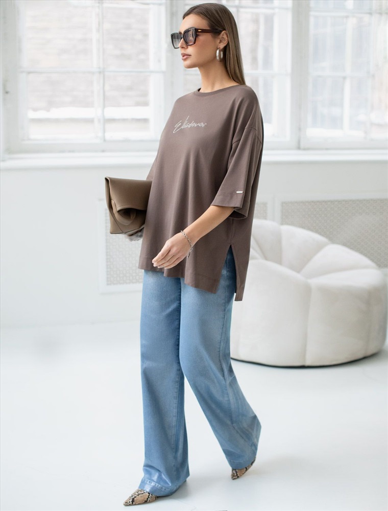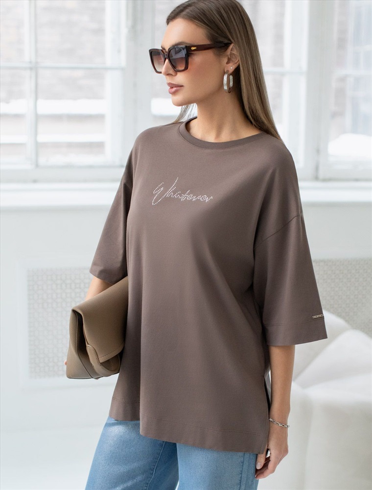 Плотность: 170 Г/м2 Оверсайз футболка кофейного цвета с из премиального хлопка с добавлением эластана создана для комфорта и стиля каждый день. Натуральный материал приятный к телу, дышащая ткань хорошо держит форму и подходит для повседневной носки дома, в офисе или на прогулке. Классический свободный крой, удлиненный прямой силуэт и свободная посадка делают эту базовую футболку универсальным решением для любой фигуры и роста, включая плюс сайз размеры и беременных девушек, отлично скроет животик. Широкие рукава держат форму и подойдут на полные руки. Нарядная футболка украшена авторским принтом в виде надписи блестящими стразами, которые создают красивый мерцающий эффект. Перевод надписи Whatever - Что бы ни... Такой акцент делает модель уместной как для особых случаев, так и для ежедневных образов. Такая эффектная длинная футболка станет универсальным дополнением гардероба, позволяя создавать разнообразные образы с акцентом на современный стиль и утонченность деталей. Благодаря стильному дизайну с боковыми разрезами эта футболка станет идеальным вариантом для создания легких и непринужденных луков. Комментарии к товару