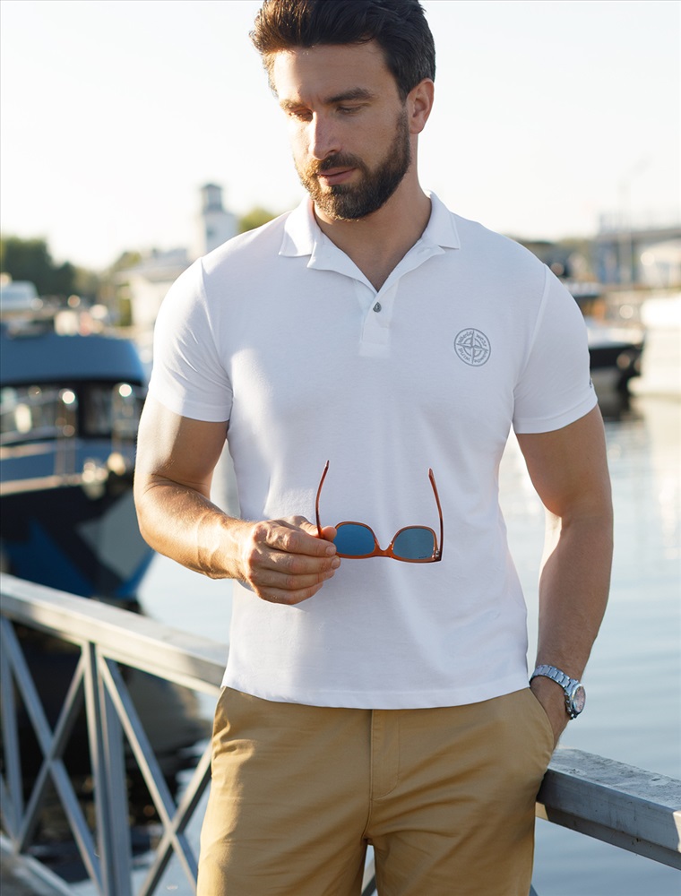 Размер товара на первом фото: 54 Футболка-поло выполнена из фактурного трикотажа. Модель с прямого кроя с небольшими разрезами по бокам дополнена вязаным воротником вышивкой с компасом. Премиальный хлопковый трикотаж гарантирует комфорт и износостойкость. На рукаве брендированная металлическая нашивка.