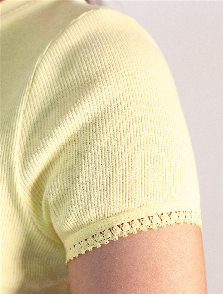 Футболка лимонного цвета с круглым вырезом из из фактурного трикотажа в рубчик идеально сочетается с повседневным стилем и подходит для домашней носки или отдыха. Мягкое полотно из хлопка обеспечивает максимальный комфорт даже в течение длительного времени. Особенность этого изделия — эластичная структура ткани, благодаря чему она хорошо тянется и подстраивается под особенности фигуры. Короткие рукава делают модель легкой и универсальной. На рукавах отделка нежным кружевом в тон основного цвета добавляет нотку романтичности. Футболка подойдет для девушек и женщин, которые ценят уют и удобство. Нежная ткань приятна к телу, не вызывает дискомфорта и позволяет коже дышать, что особенно важно в повседневной жизни. Футболка в мелкий рубчик полуприлегающего кроя визуально вытягивает силуэт и делает фигуру более стройной. Разнообразие размеров позволяет выбрать подходящий вариант для любых параметров, в том числе на большие размеры. Эта красивая футболка практична и незаменима для тех, кто ищет качественные и стильные вещи на каждый день.