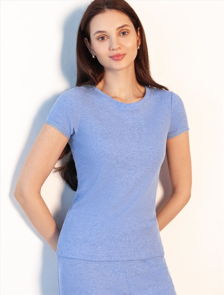 Плотность: 150 Г/м2 Футболка голубого цвета с эффектом меланж с круглым вырезом из фактурного трикотажа в рубчик идеально сочетается с повседневным стилем и подходит для домашней носки или отдыха. Мягкое полотно из хлопка обеспечивает максимальный комфорт даже в течение длительного времени. Особенность этого изделия — эластичная структура ткани, благодаря чему она хорошо тянется и подстраивается под особенности фигуры. Короткие рукава делают модель легкой и универсальной. На рукавах отделка нежным кружевом в тон основного цвета добавляет нотку романтичности. Футболка подойдет для девушек и женщин, которые ценят уют и удобство. Нежная ткань приятна к телу, не вызывает дискомфорта и позволяет коже дышать, что особенно важно в повседневной жизни. Футболка в мелкий рубчик полуприлегающего кроя визуально вытягивает силуэт и делает фигуру более стройной. Разнообразие размеров позволяет выбрать подходящий вариант для любых параметров, в том числе на большие размеры. Эта красивая футболка практична и незаменима для тех, кто ищет качественные и стильные вещи на каждый день. Рекомендуем сочетать с артикулами: D48.011, D48.012, D44.160, D44.161, D44.162, D44.163, D46.058, D40.001, D40.002, D40.003 Комментарии к товару