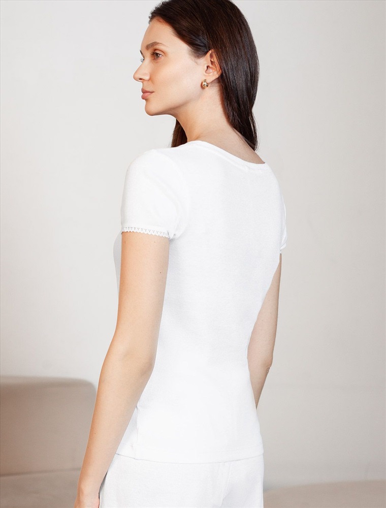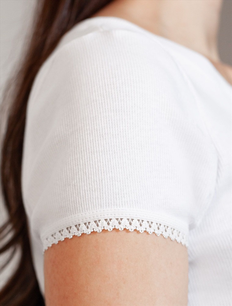 Плотность: 150 Г/м2 Футболка белого цвета с круглым вырезом из из фактурного трикотажа в рубчик идеально сочетается с повседневным стилем и подходит для домашней носки или отдыха. Мягкое полотно из хлопка обеспечивает максимальный комфорт даже в течение длительного времени. Особенность этого изделия — эластичная структура ткани, благодаря чему она хорошо тянется и подстраивается под особенности фигуры. Короткие рукава делают модель легкой и универсальной. На рукавах отделка нежным кружевом в тон основного цвета добавляет нотку романтичности. Футболка подойдет для девушек и женщин, которые ценят уют и удобство. Нежная ткань приятна к телу, не вызывает дискомфорта и позволяет коже дышать, что особенно важно в повседневной жизни. Футболка в мелкий рубчик полуприлегающего кроя визуально вытягивает силуэт и делает фигуру более стройной. Разнообразие размеров позволяет выбрать подходящий вариант для любых параметров, в том числе на большие размеры. Эта красивая футболка практична и незаменима для тех, кто ищет качественные и стильные вещи на каждый день. Рекомендуем сочетать с артикулами: D48.011, D48.012, D44.160, D44.161, D44.162, D44.163, D46.058, D40.001, D40.002, D40.003 Комментарии к товару