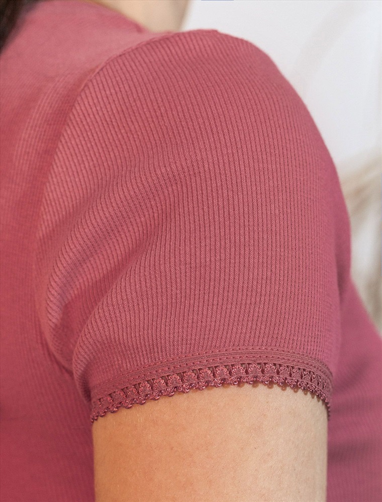 Плотность: 150 Г/м2 Футболка темно-кораллового цвета с круглым вырезом из из фактурного трикотажа в рубчик идеально сочетается с повседневным стилем и подходит для домашней носки или отдыха. Мягкое полотно из хлопка обеспечивает максимальный комфорт даже в течение длительного времени. Особенность этого изделия — эластичная структура ткани, благодаря чему она хорошо тянется и подстраивается под особенности фигуры. Короткие рукава делают модель легкой и универсальной. На рукавах отделка нежным кружевом в тон основного цвета добавляет нотку романтичности. Футболка подойдет для девушек и женщин, которые ценят уют и удобство. Нежная ткань приятна к телу, не вызывает дискомфорта и позволяет коже дышать, что особенно важно в повседневной жизни. Футболка в мелкий рубчик полуприлегающего кроя визуально вытягивает силуэт и делает фигуру более стройной. Разнообразие размеров позволяет выбрать подходящий вариант для любых параметров, в том числе на большие размеры. Эта красивая футболка практична и незаменима для тех, кто ищет качественные и стильные вещи на каждый день. Рекомендуем сочетать с артикулами: D48.011, D48.012, D44.160, D44.161, D44.162, D44.163, D46.058, D40.001, D40.002, D40.003 Комментарии к товару