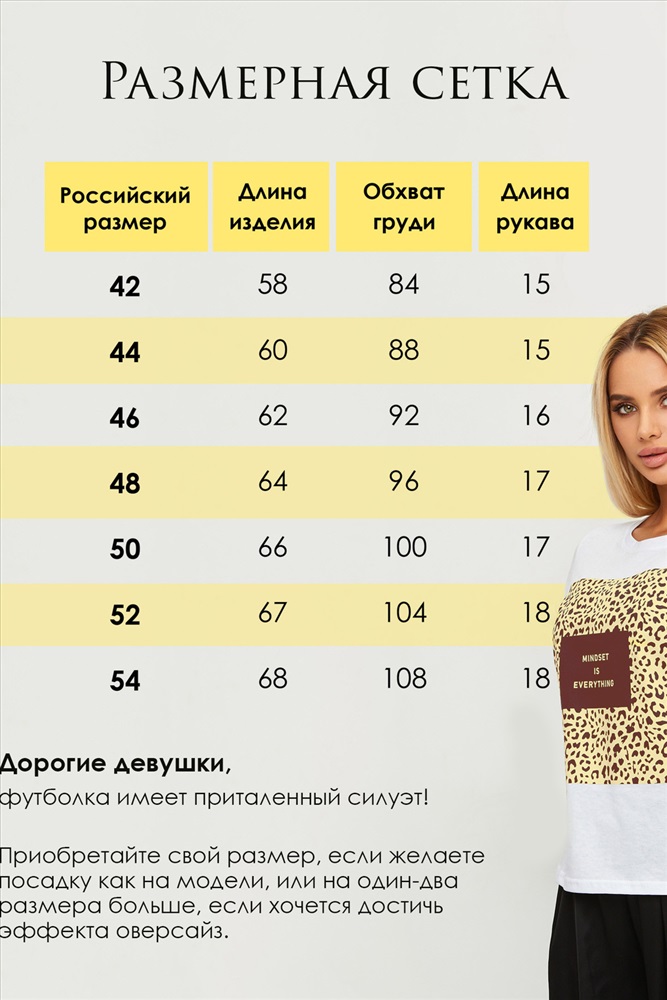 Состав: хлопок 100% Модель: Футболка с леопардовым принтом ЛЕОWSP Тип товара: футболка Материал: кулирка | кулирка Бренд: IREN RENETTI Отделка: с печатью Рисунок: анималистичный | надпись Рукав: короткий рукав Сезонность: лето | осень | весна | зима Силуэт: полуприлегающий Стиль: повседневный Футболка классического фасона, прямого кроя оверсайз с коротким рукавом сделанная из 100% хлопка. Идеально для повседневной носки и занятия спортом. Рекомендации по уходу: стирать следует при 30 градусах в режиме бережной стирки. Размерная сетка включается в себя большие размеры. Параметры футболки указаны на 4-й фотографии в карточке. Сделана так, чтобы украсить гардероб самых стильных модниц так и мужчин с принтом больших размеров. Принт модная майка базовая с надписью рисунком леопард отлично подойдет для любого образа. Футболка удлиненная - подарок на День рождения, и другие праздники. Лонгслив будет эффектно смотреться как с юбками, так и с джинсами, брюками. Футболка oversize летняя длинная хорошо сидит на женщинах и девушках с любым типом фигуры, в том числе беременных и кормящих мамах. Кофта школьная для девочек и подростков легко сочетать с вещами из гардероба - подойдет как к деловому стилю, для школы так и расслабленному спортивному комплекту, впишется в casual образ. Таблица размеров и веса