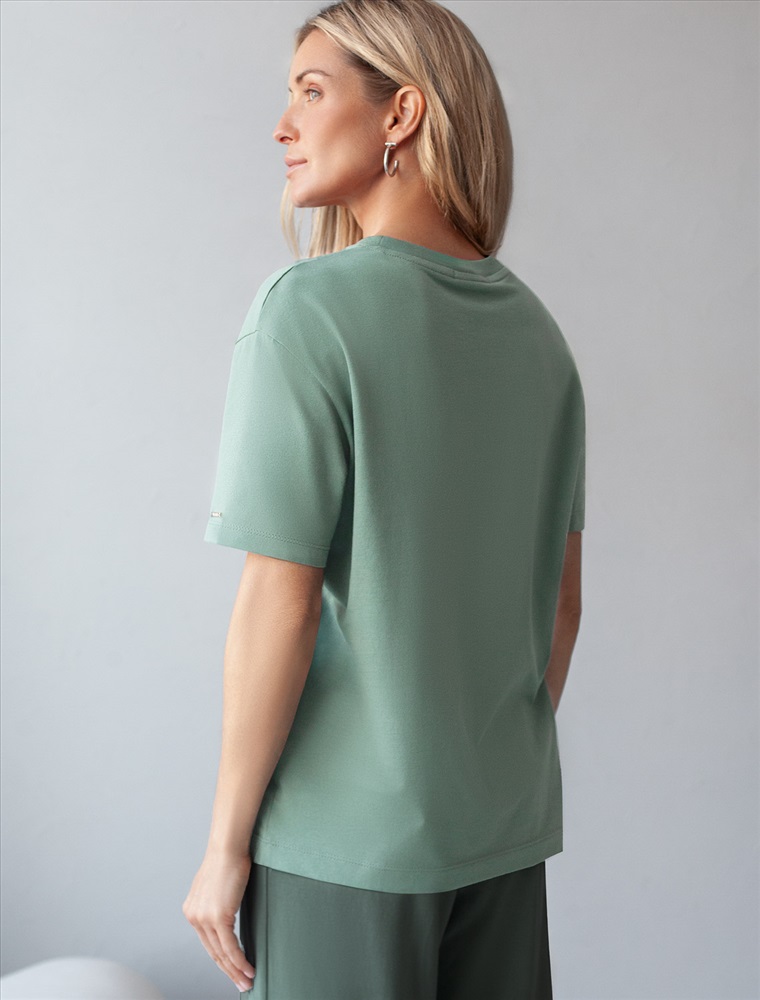 Футболка светло-оливкового цвета изготовлена из премиального хлопка с эластаном, она обеспечивает невероятное ощущение уюта и легкости. Натуральный материал сохраняет форму и цвет после множества стирок, обеспечивая долговечность изделия, а его высокая воздухопроницаемость создает ощущение свежести даже в течение долгого дня.