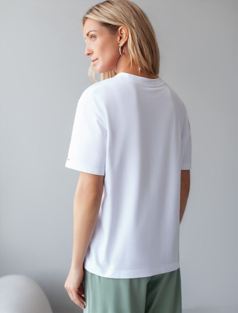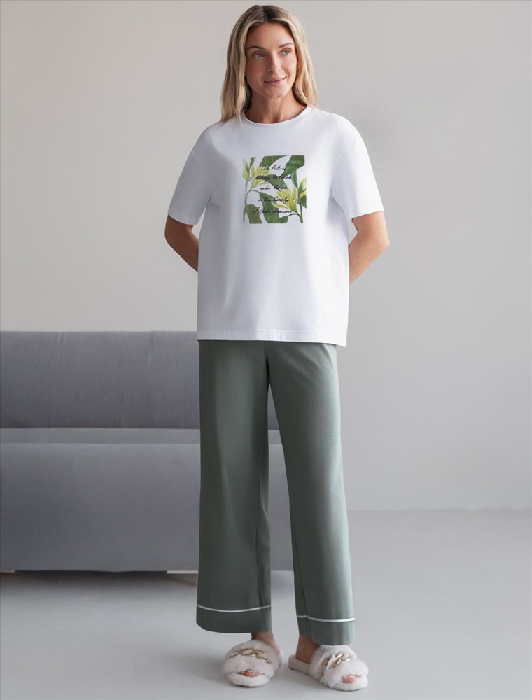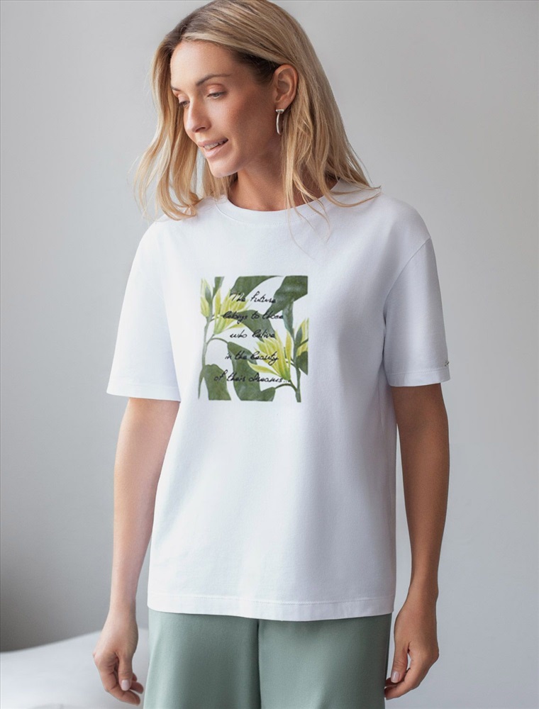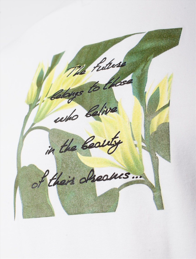 Плотность: 170 Г/м2 Размер товара на первом фото: 42 Футболка белого цвета изготовлена из премиального хлопка с эластаном, она обеспечивает невероятное ощущение уюта и легкости. Натуральный материал сохраняет форму и цвет после множества стирок, обеспечивая долговечность изделия, а его высокая воздухопроницаемость создает ощущение свежести даже в течение долгого дня. Особое внимание привлекает стильный принт в виде листьев и цветов с надписью, выполненный красками с устойчивым покрытием, который добавляет изделию оригинальности и позволяет выразить индивидуальность. Перевод надписи: The future belongs to those who believe in the beauty of their dreams - Будущее принадлежит тем, кто верит в красоту своей мечты. Свободный крой футболки дарит удобство и не стесняет движений, что делает ее идеальной для повседневной носки или активного отдыха, подчеркивает современный взгляд на моду. На рукаве металлический логотип бренда. Подойдет девушкам и женщинам на любую фигуру, вы будете чувствовать себя в ней уверенно и комфортно. Отлично впишется в гардероб благодаря универсальному дизайну, который легко сочетать с джинсами, шортами или спортивными брюками. Комментарии к товару